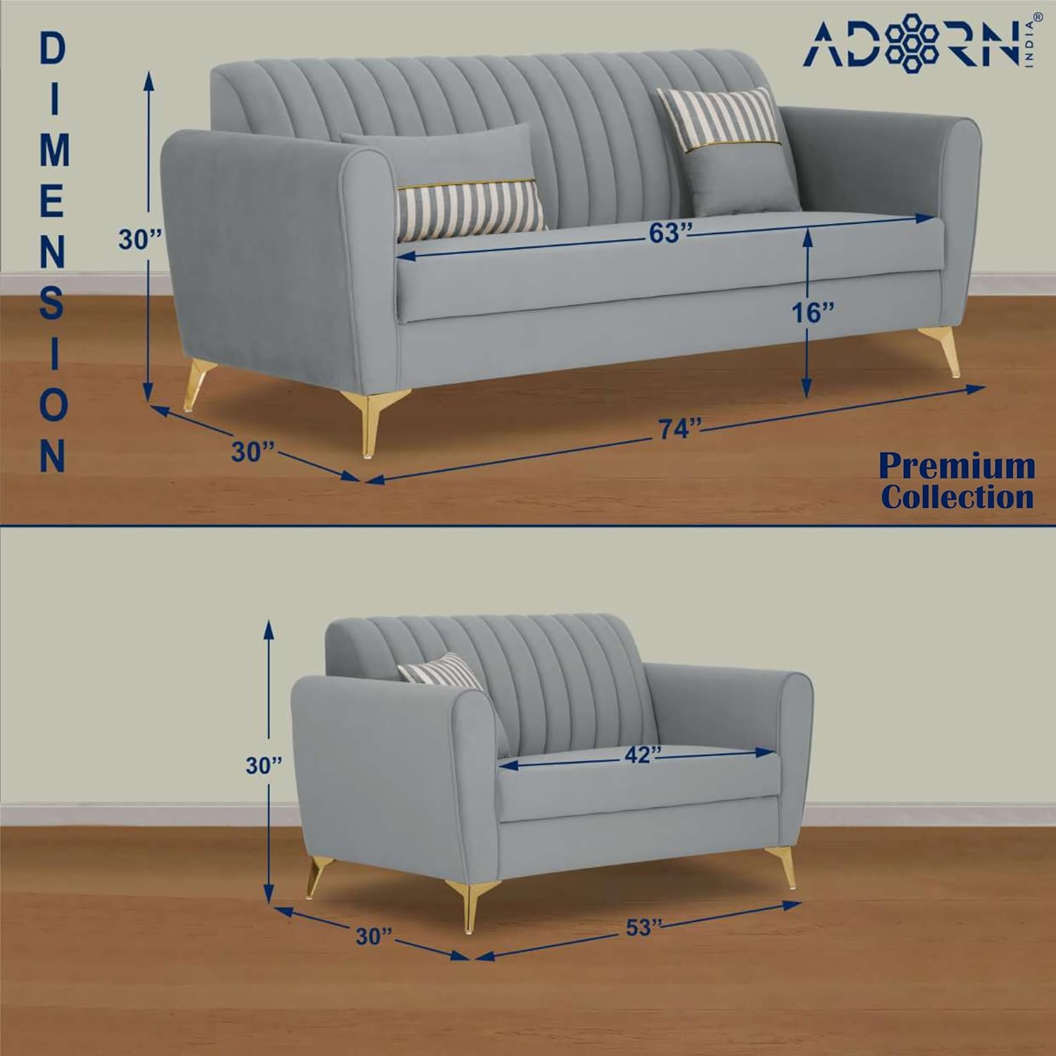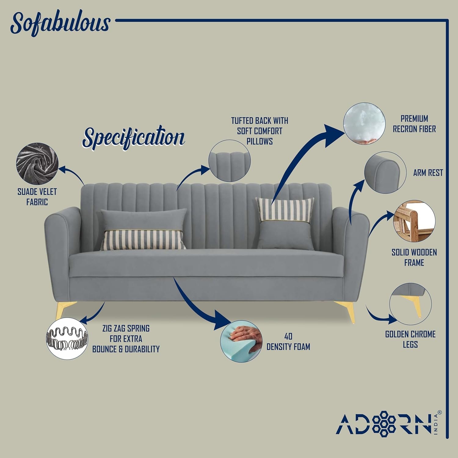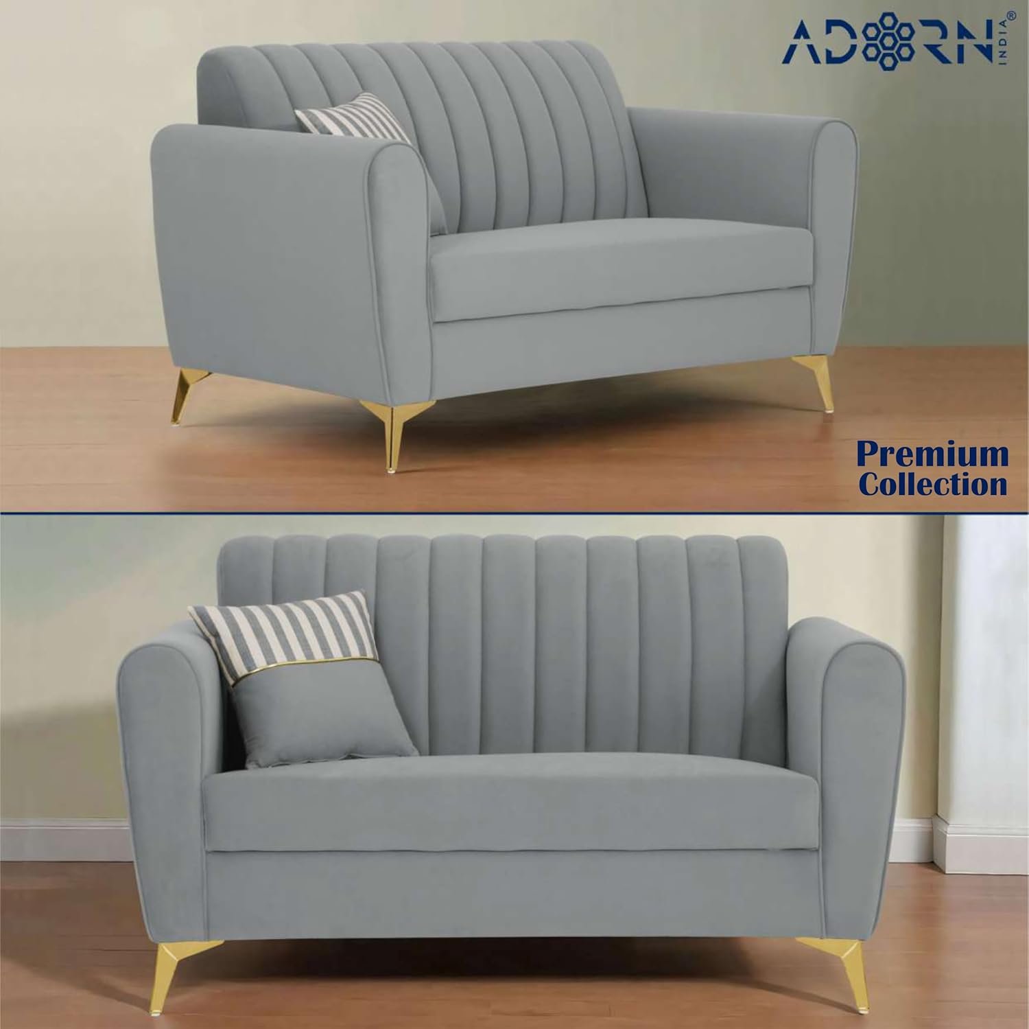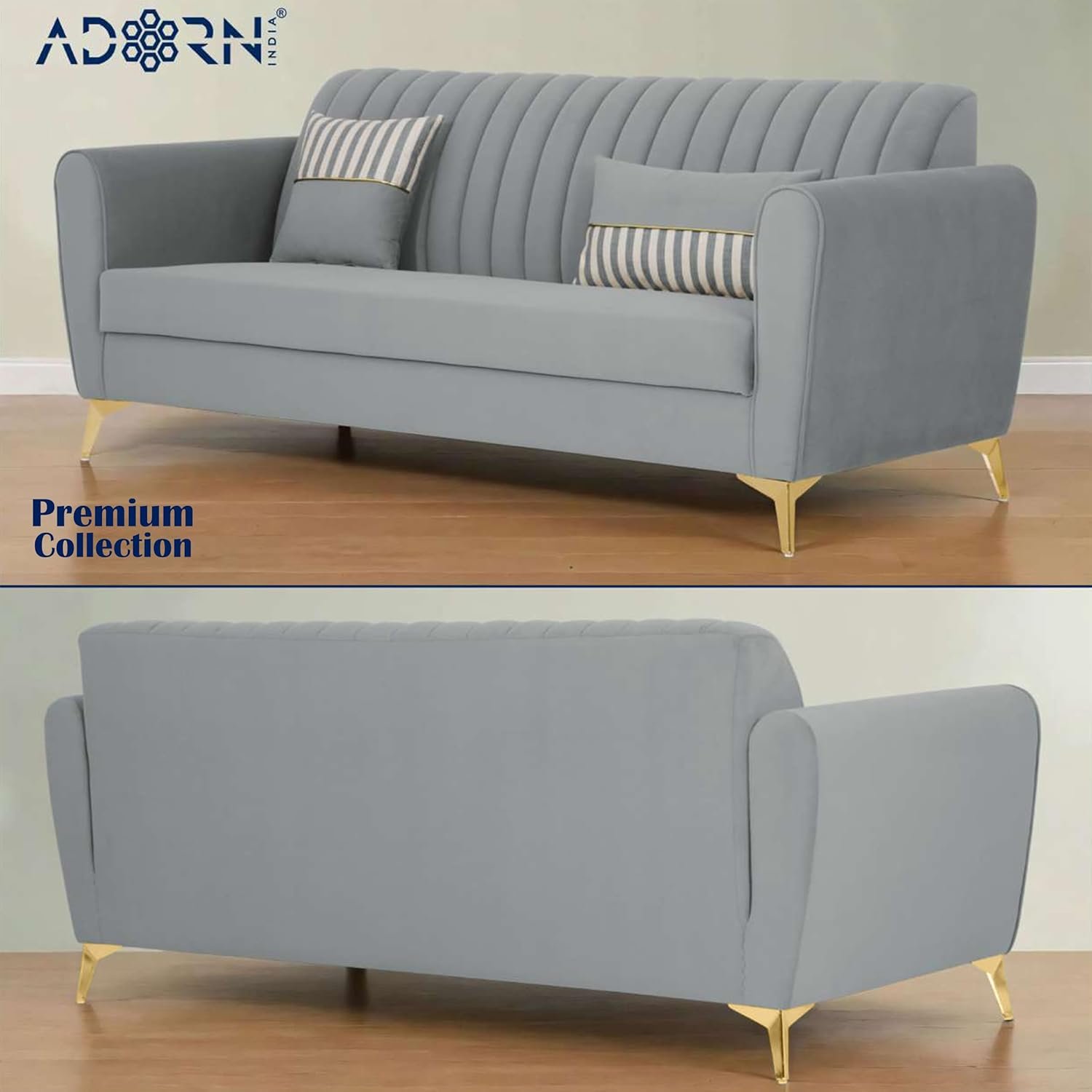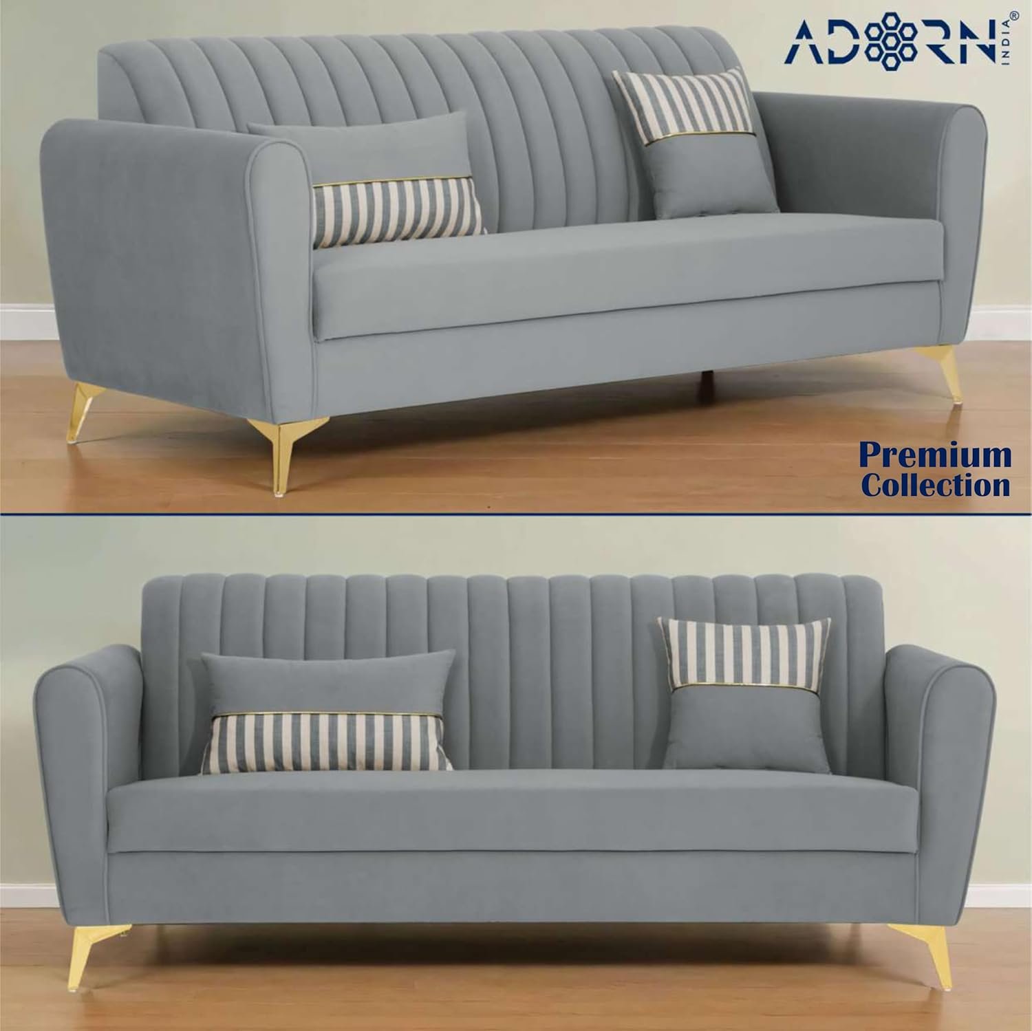 Adorn India Premium Luster 3+2 Sofa Set | Velvet Suede Fabric | 3-Year Warranty | Color Grey with Golden Legs & Striped Pattern Cushion