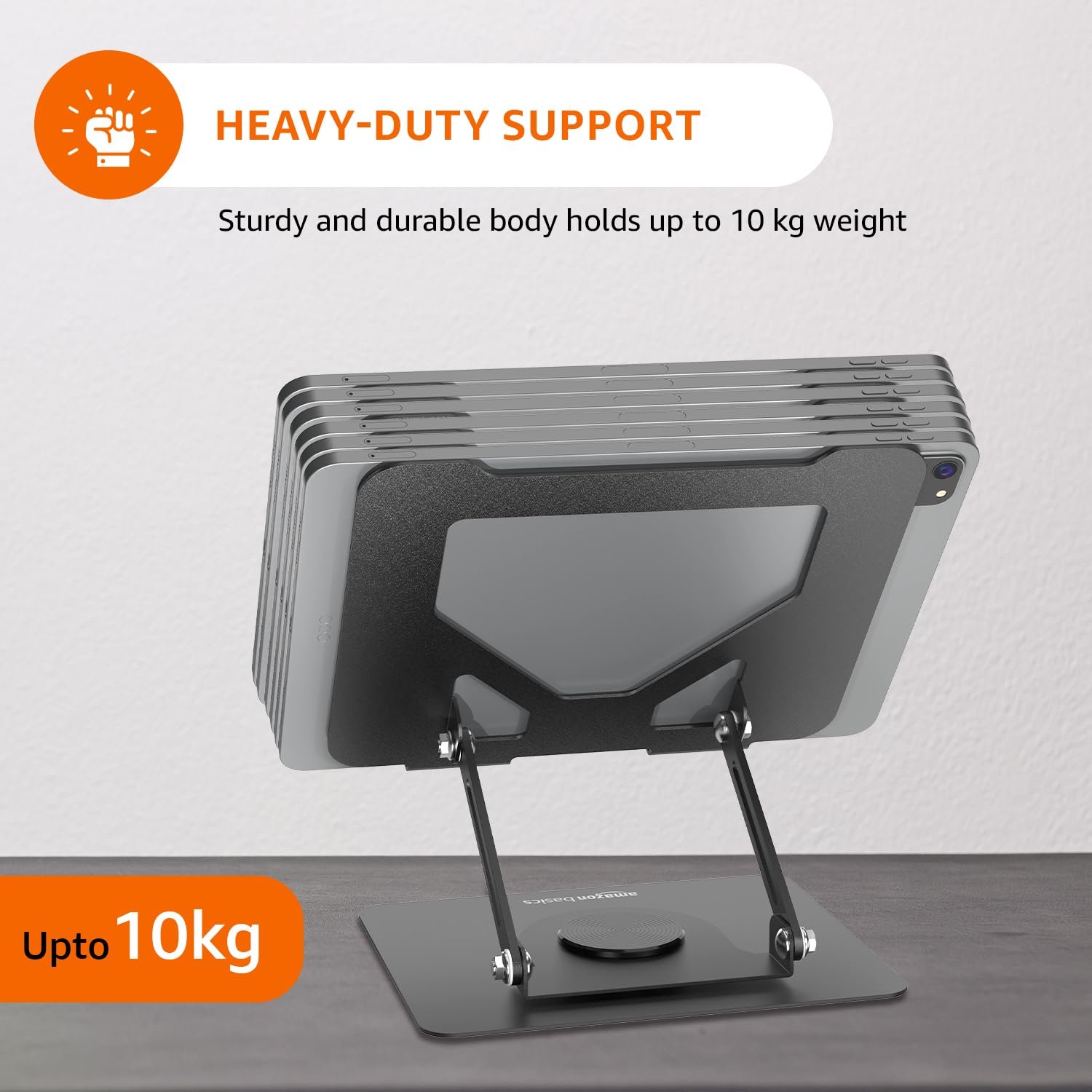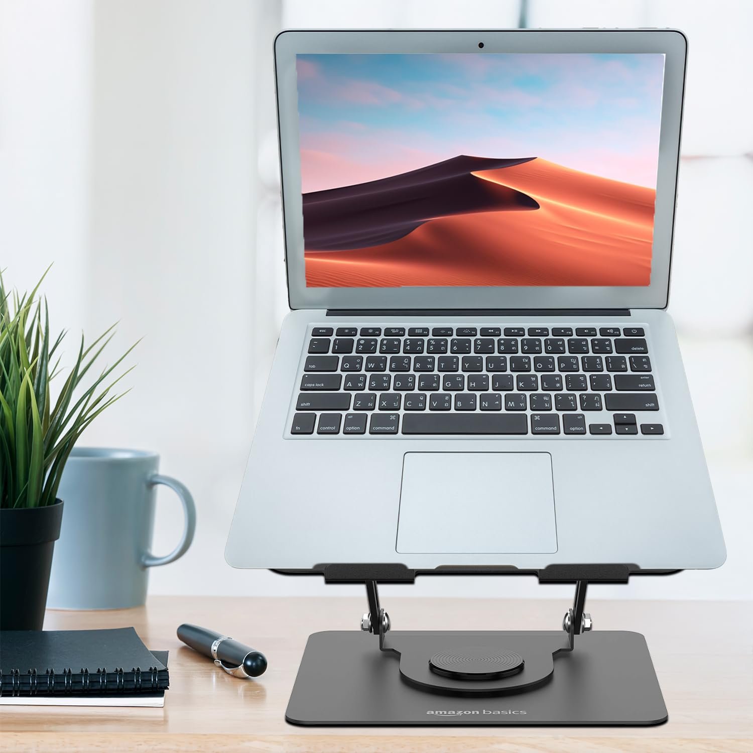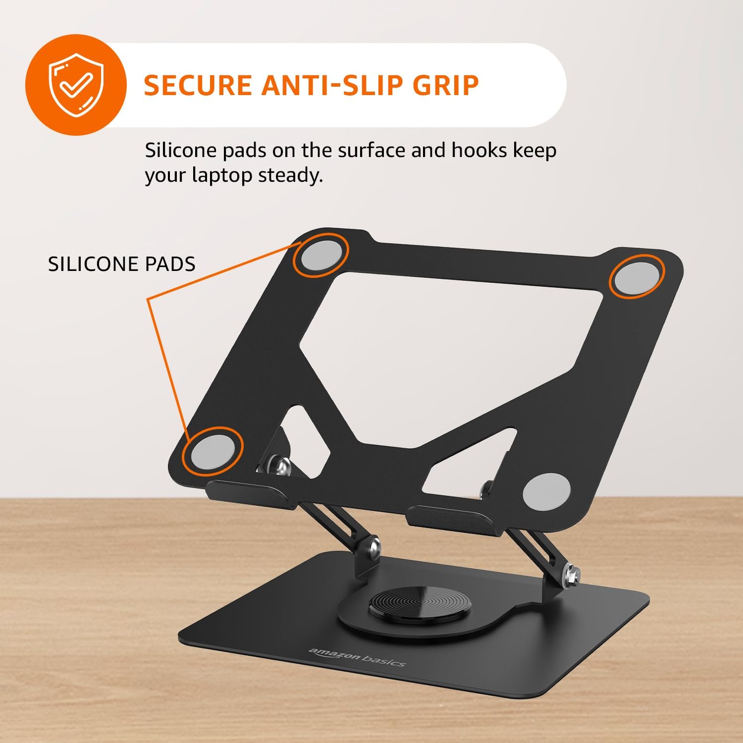 Amazon Basics 360° Rotating Metal Laptop Stand (Black)| Adjustable Height & Angle | Foldable, Sturdy Carbon Steel | Enhanced Airflow | Supports up to 10kg | Compatible with Laptops & MacBook