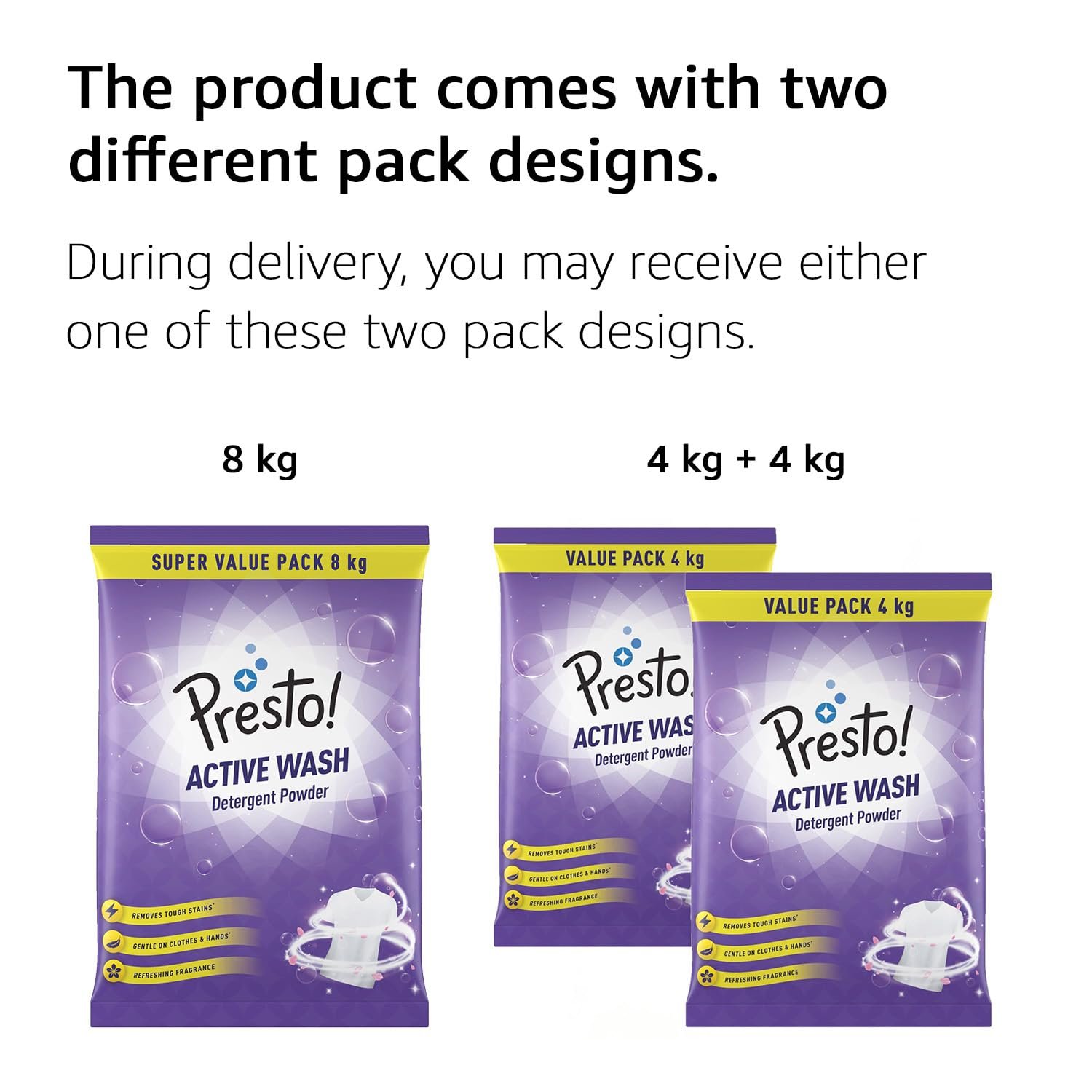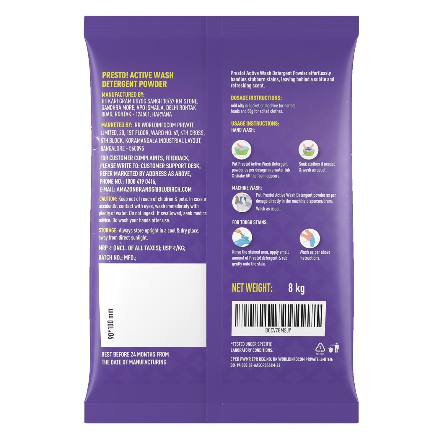 Amazon Brand – Presto! Active Wash Detergent Powder | 8 Kg | Tough On Stains | Gentle On Fabrics | Colour-Safe | Refreshing Fragrance | Machine And Hand Wash