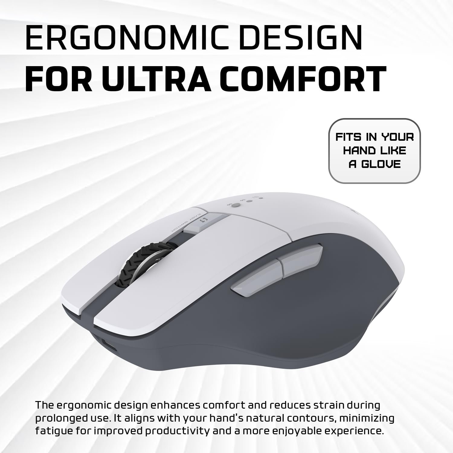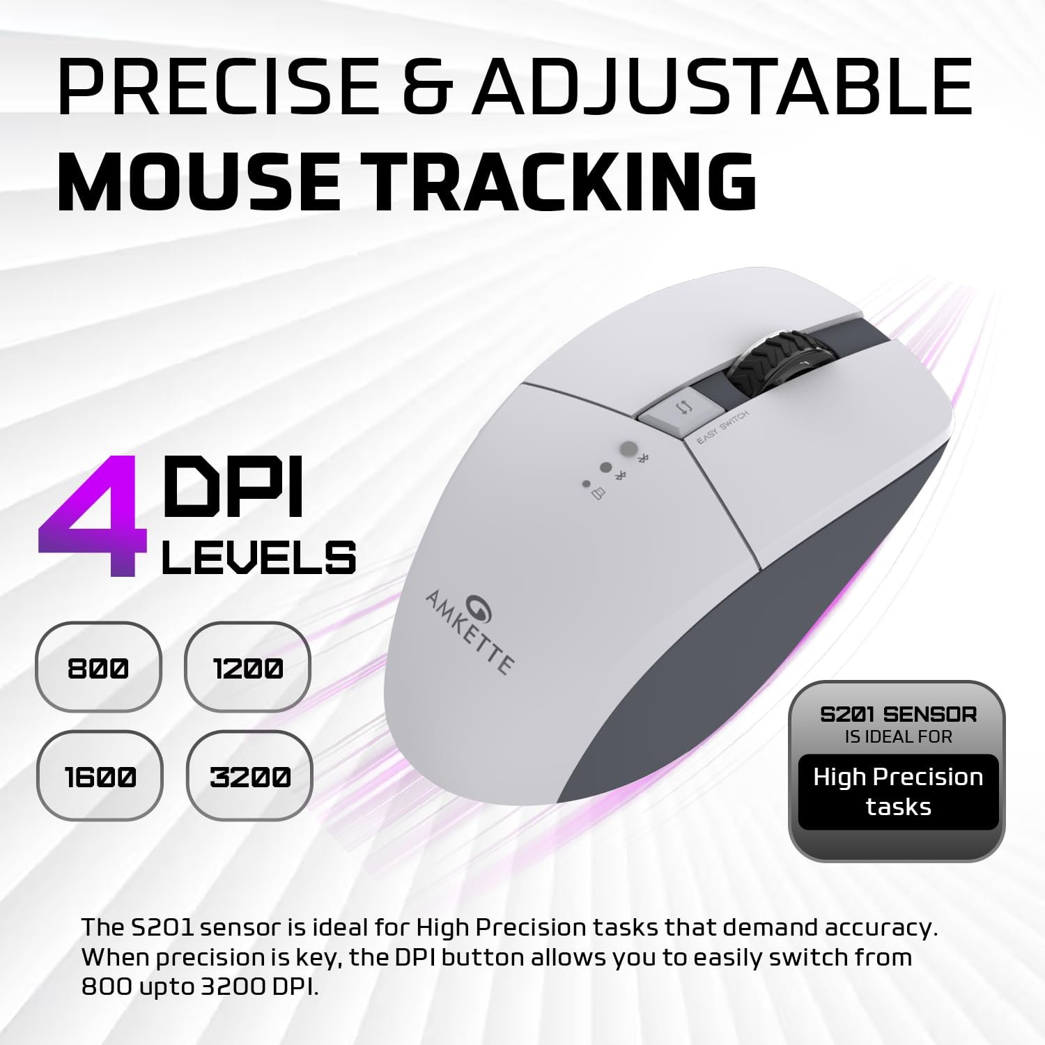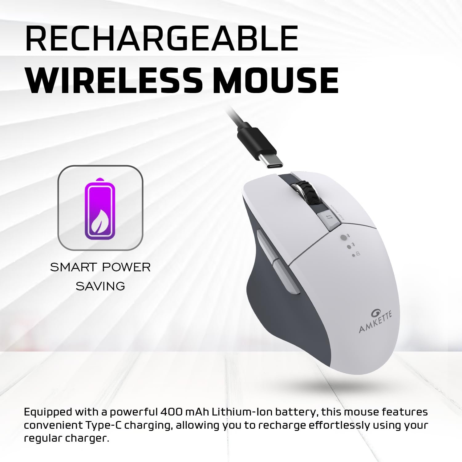 Amkette Hush Pro Epic M Rechargeable Wireless Mouse/Bluetooth Mouse | 3 Device Connectivity (2xBT&2.4G) with Top Mounted Device Switch Button, Silent Switches, Ergonomic Design, Upto 3200 DPI (White)