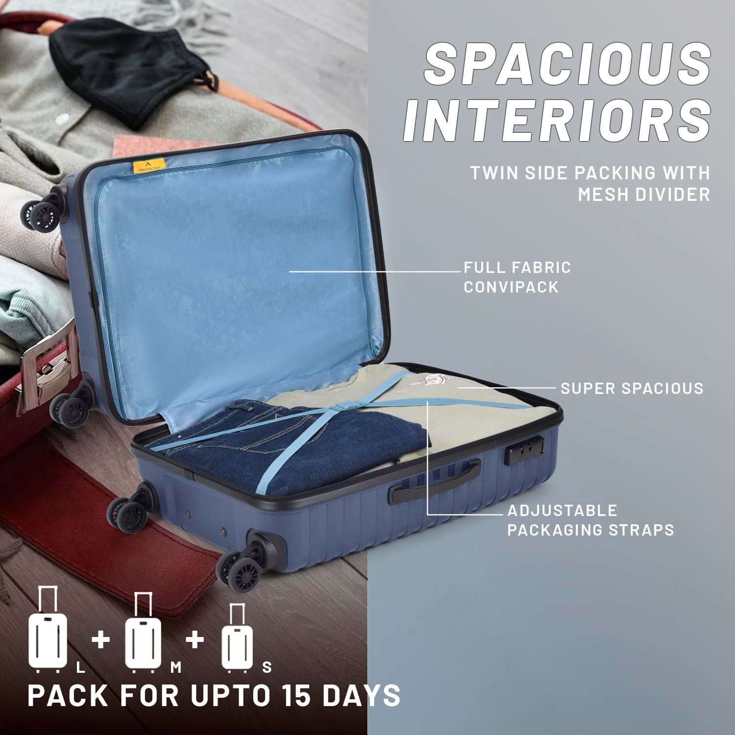 Aristocrat 3 Pc Airpro Set Cabin 55cm(Small) Check-in 66cm(Medium) Check-in 75cm(Large) 8 Wheels Spinner Trolley Bags, Hard Case Luggage, Lightweight Bag & Combination Lock|3 Years Warranty (Blue)