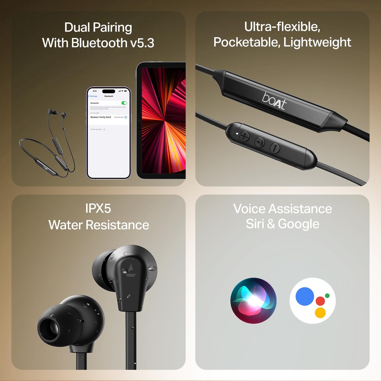Boat 2025 Launch Rockerz Trinity Grande, 150H Battery, Hi Res Audio by LDAC, Dual Pair, ENx Tech, Stream Ad Free Music via App Support, Bluetooth Neckband, Wireless with Mic Earphones (Black)