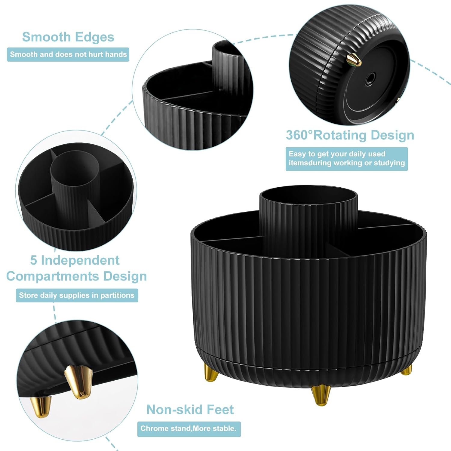Cayxenful Pencil Holder For Desk,5 Slots 360°Degree Rotating Desk Organizers And Accessories,Desktop Storage Stationery Supplies Organizer, Cute Pencil Cup Pot For Office, School, Home (H-Black)