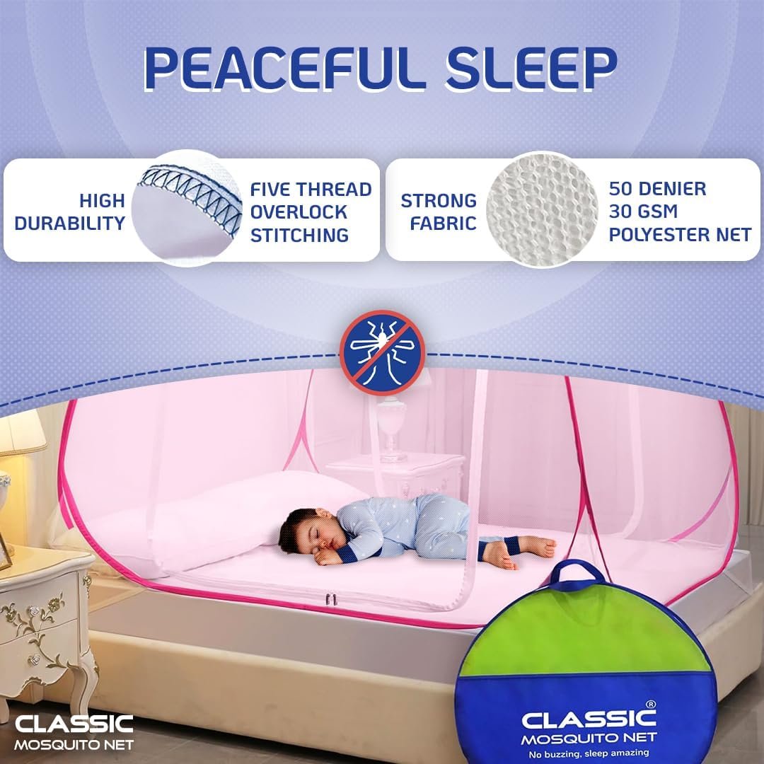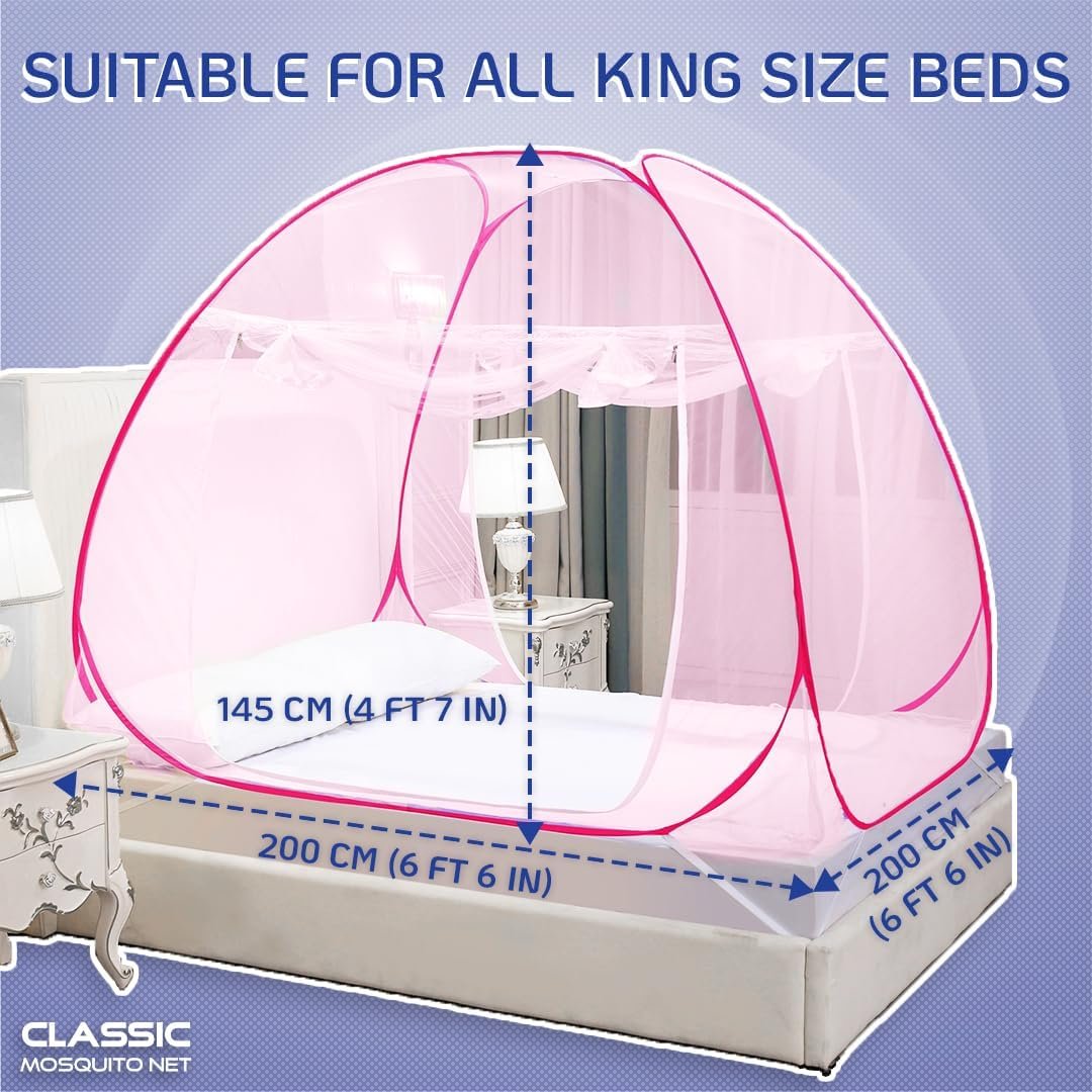 Classic Net for Double Bed Foldable Machardani Polyester 30GSM Strong Net PVC Coated Corrosion Resistant Steel Wire 1.King Size (Width 190cms to 210cms) Full Pink