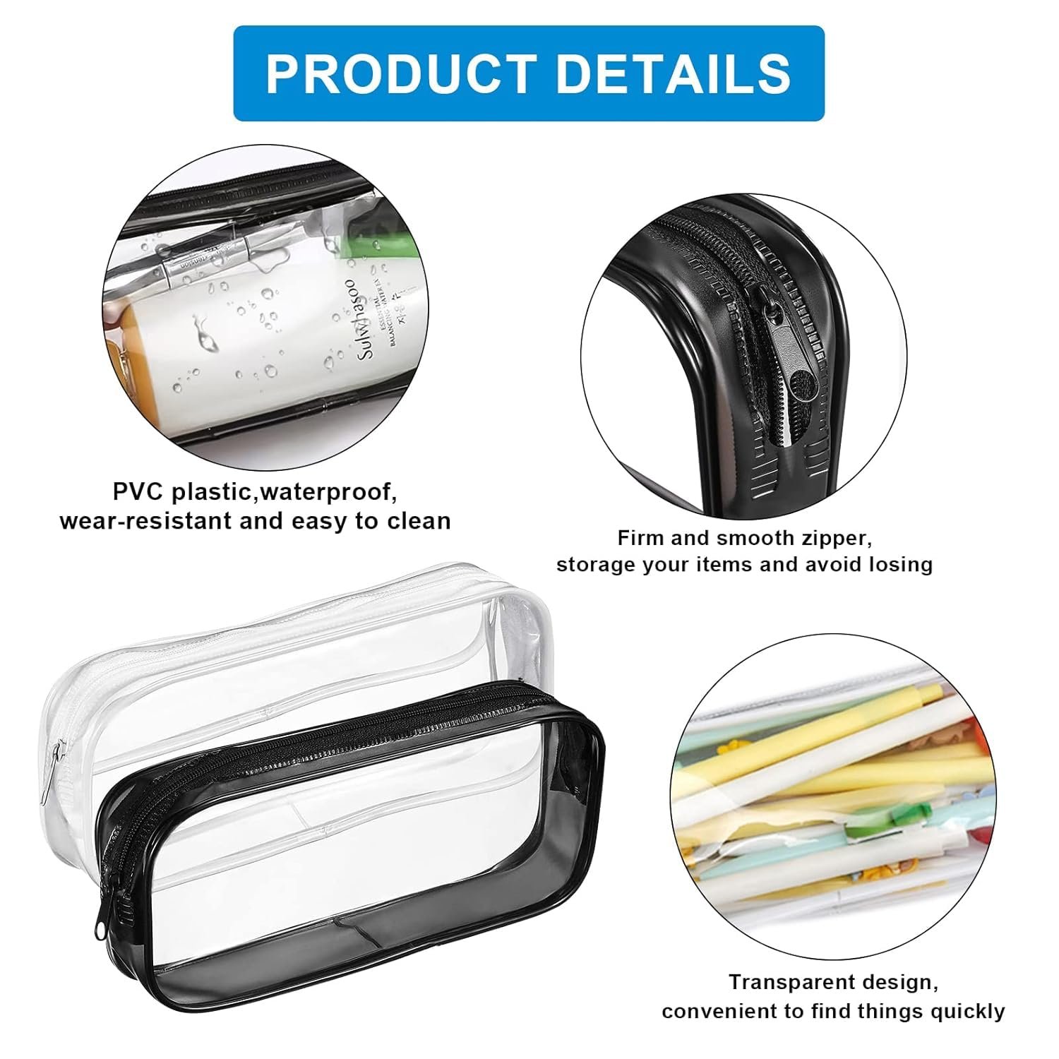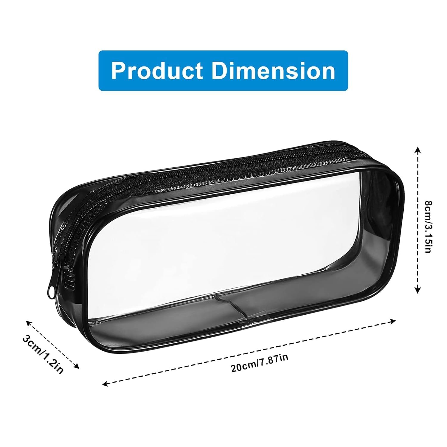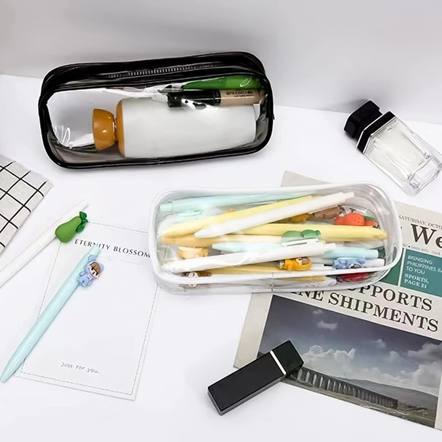 Clear Pencil Case Set of 2, Transparent PVC Zipper Pouch Black and White, Waterproof Cosmetic Makeup Bag, Portable Stationery Organizer for School Office Travel (20 × 8 × 3 cm)