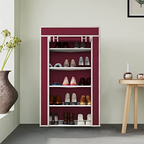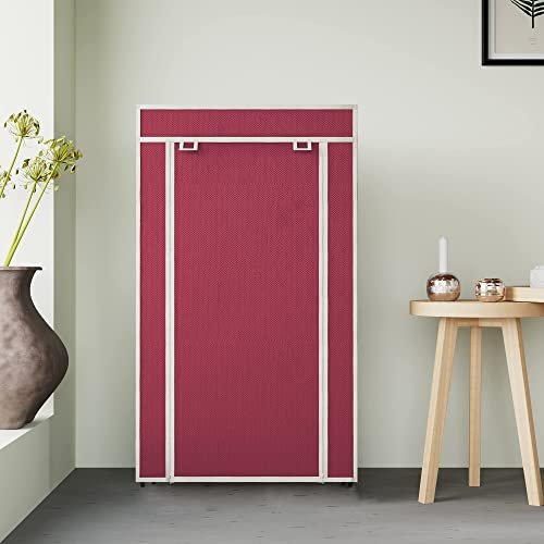 Collapsible Portable Foldable Wardrobe Storage Shelves Organizer for Clothes Racks Fabric Almirah Non Rustable Iron Storage Unit (5 Layer) (Maroon)