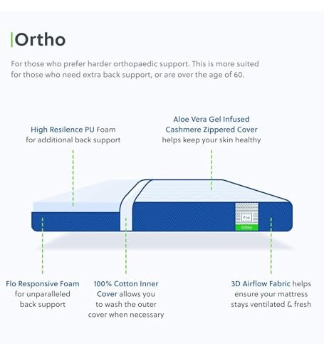 Be the first to review “Flo Ortho™ Aloe Vera Infused Orthopedic Mattress with Pain Release™ Technology | Medium Firm Feel | 4 inch Mattress in Queen Size (78x60x4 Inches) | 10 Year Warranty”