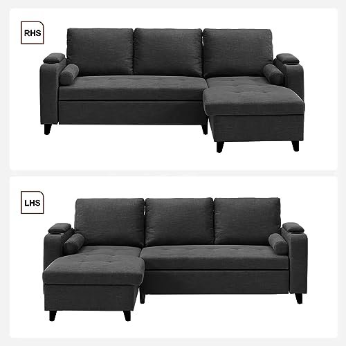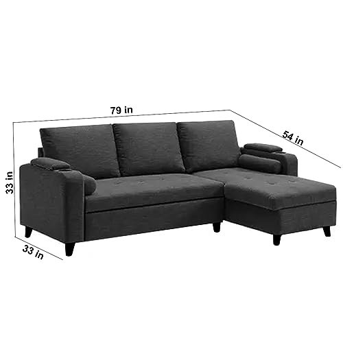 FURNY Rolstar 4 Seater Fabric RHS L Shape Sofa Set with Cupholder & Puffed Arms (Dark Grey)