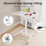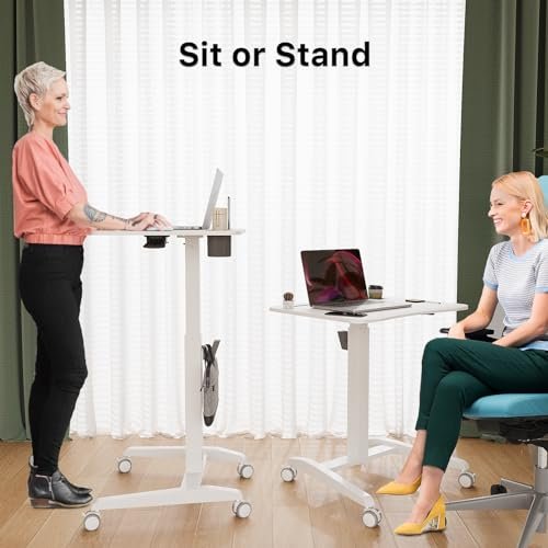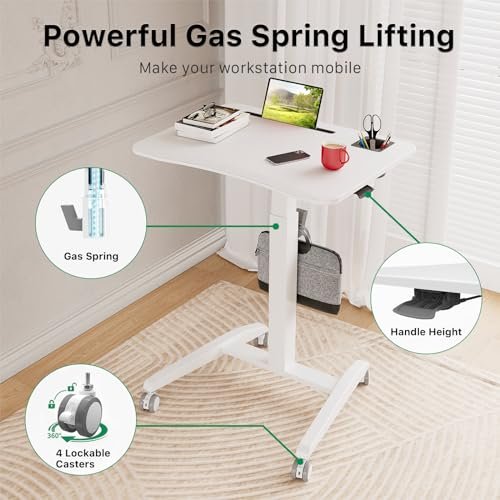 Gibbon Mounts Mobile Standing Desk, Pneumatic Height Adjustable Rolling Table for Laptop and Computer, Portable Sit Stand Desk with Wheels and Hook, White