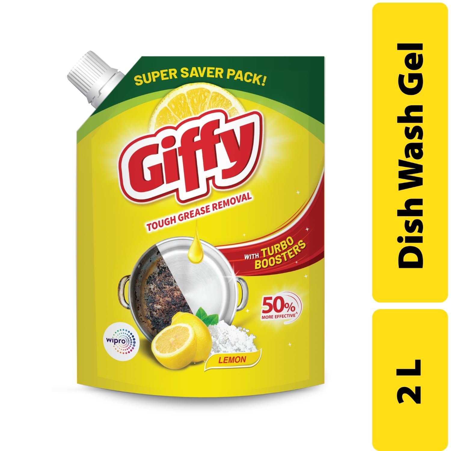 Giffy Liquid Dishwash Gel 2 Litre | Lemon and Active Salt | 50% More Effective | Tough Grease Removal Expert | Turbo Boosters | Mild fragrance | Removes Tough Malodour | Hand-Safe