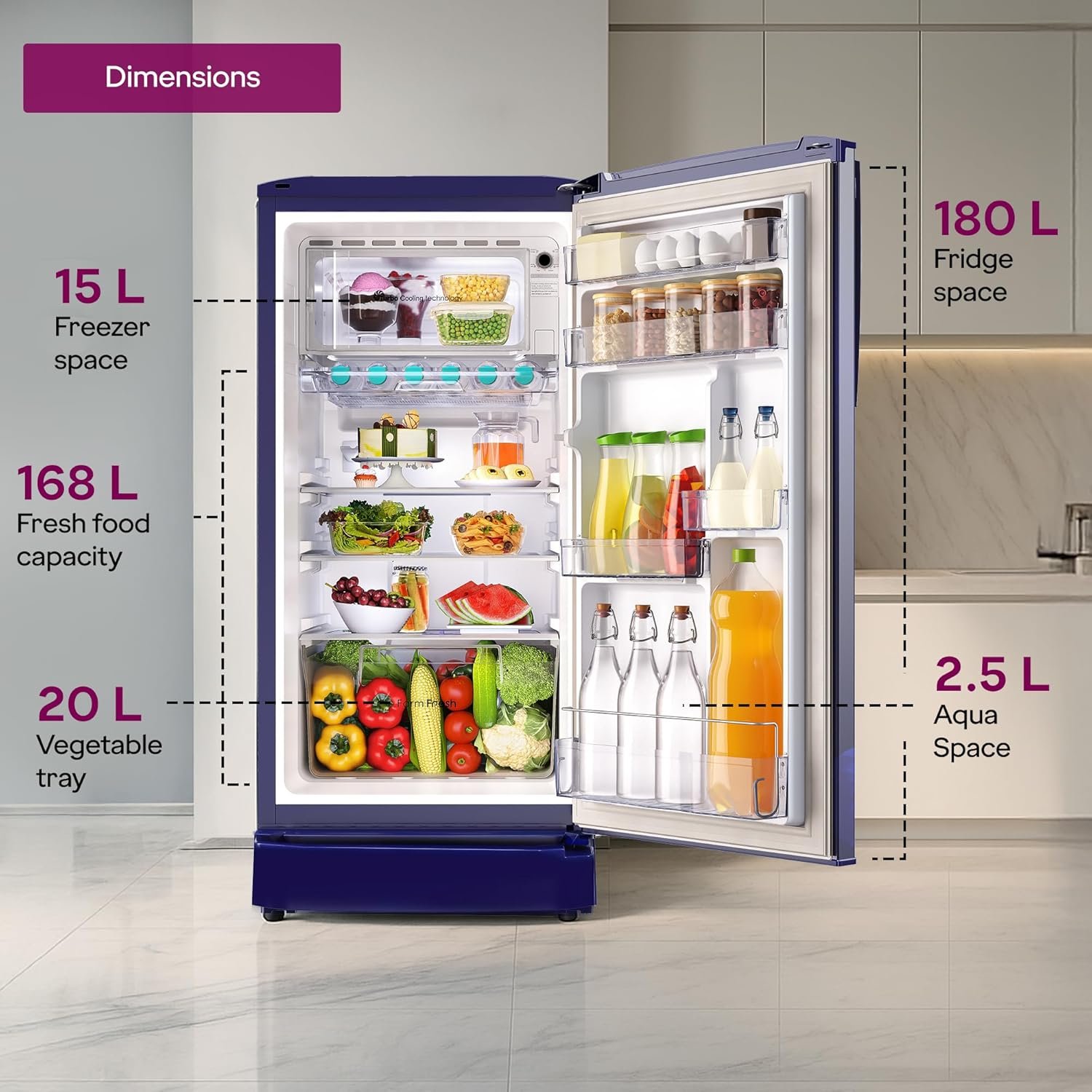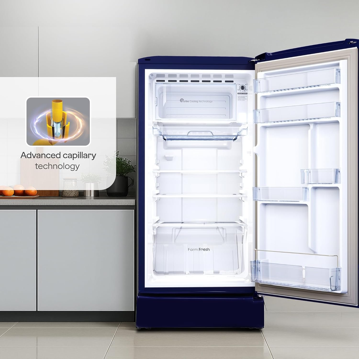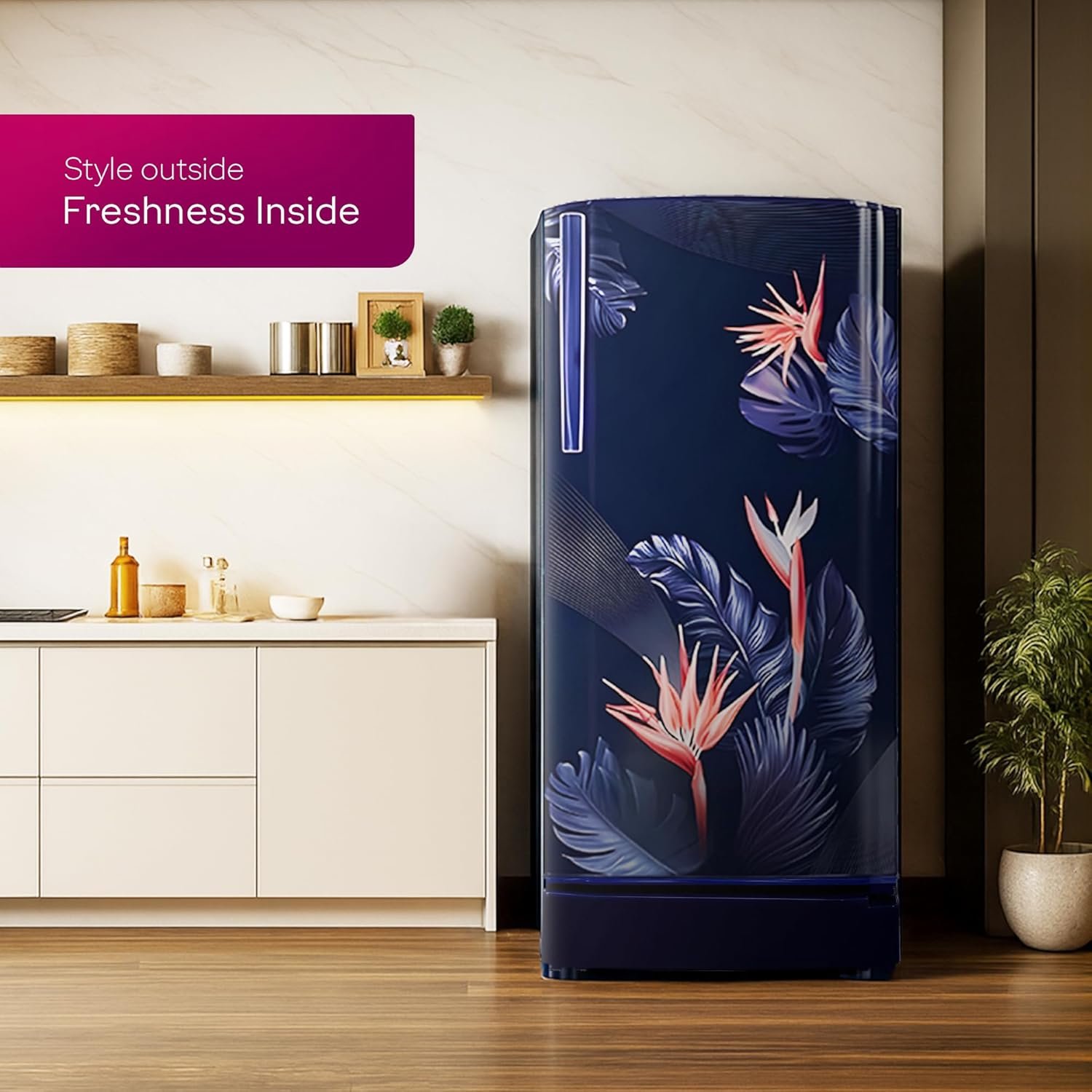 Godrej 183 L 3 Star | Toughened Glass Shelves | 24 Day Farm Freshness | Jumbo Vegetable Tray | Turbo Cooling Technology | Direct Cool Single Door Refrigerator (RD R190C THF FR BL, Floral Blue)