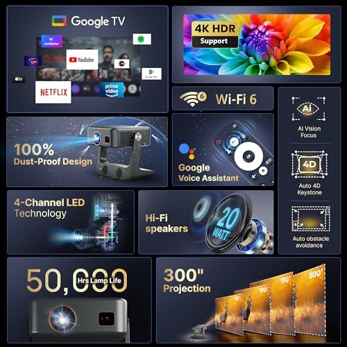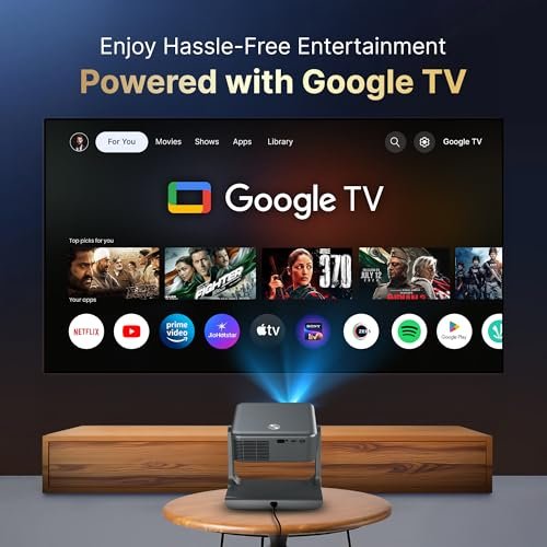 [Google TV Official] Crossbeats Lumex Solis Projector 4k Ultra HD, 1080p Native, Android OS WiFi, 1000 ANSI, Smart Mini Projector for Room, Portable Home Theater Cinema, Built-in Apps, 300”Display
