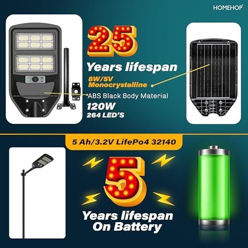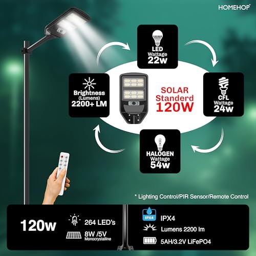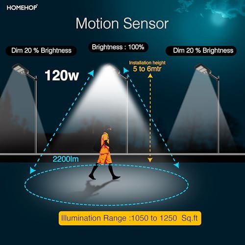 Homehop Solar Street Light Outdoor Waterproof 120 Watt LED Wireless Motion Sensor Lamp with Pole for Home, Garden, Wall, Pathway, Dusk to Dawn (ABS- Cool Light)