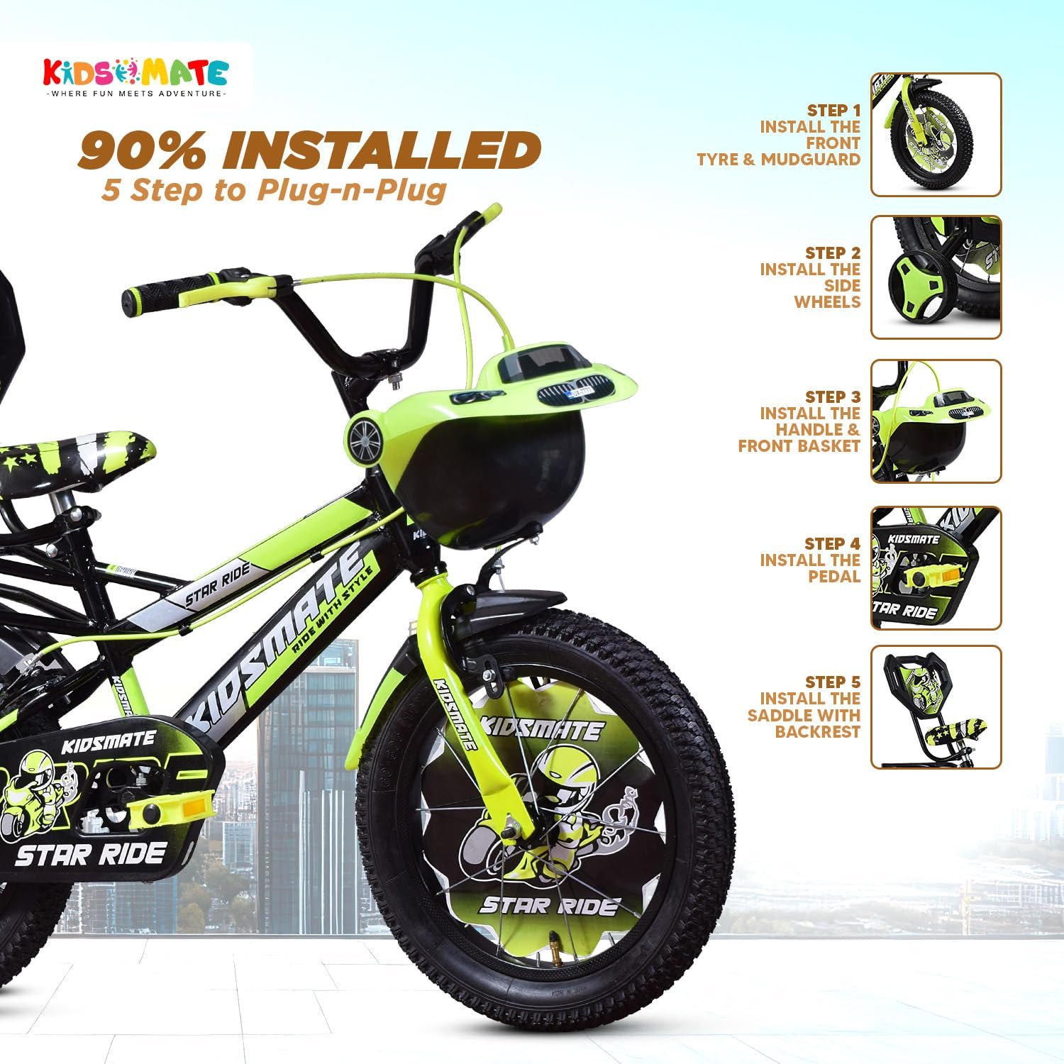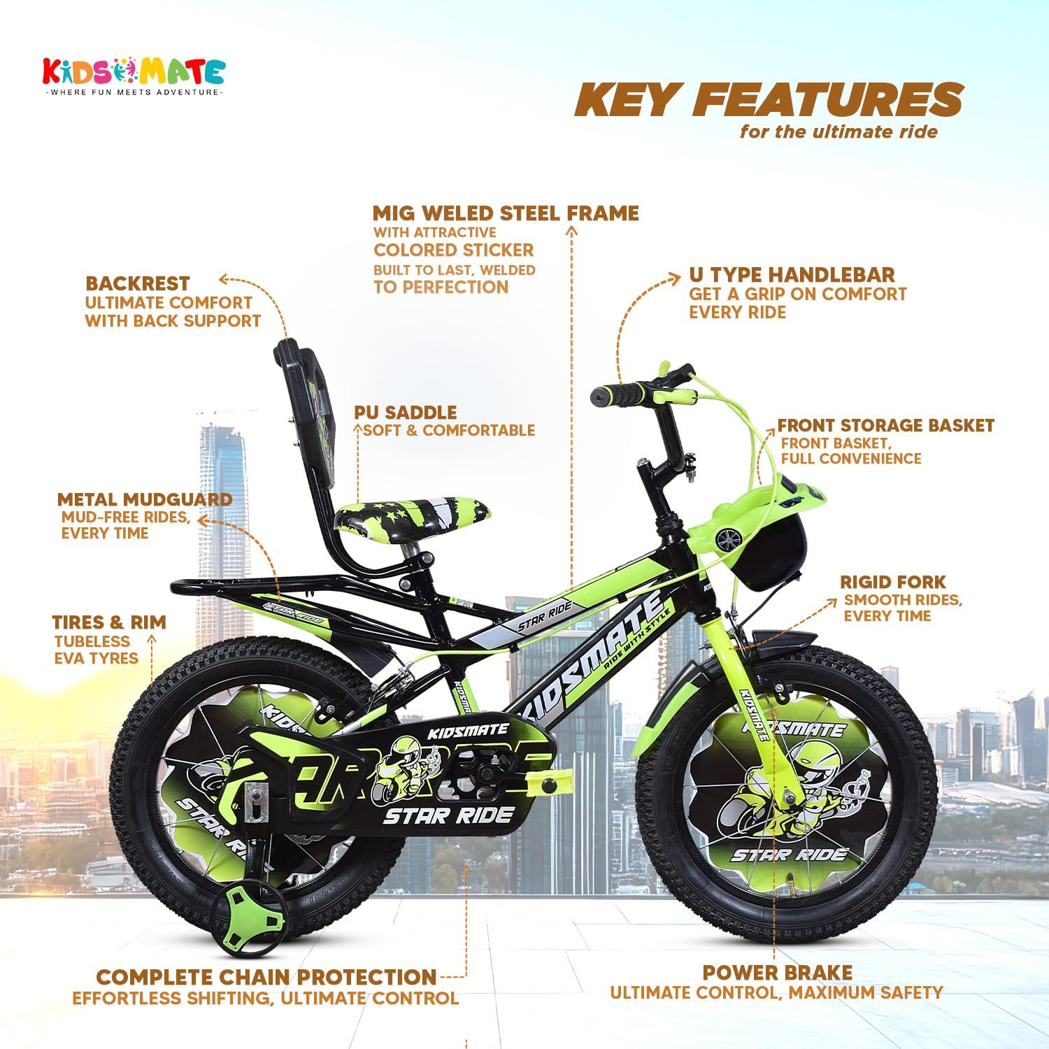 Kidsmate Star Ride 16T Kids Bicycle with Training Wheels | Cycle for Kids Featuring Front Basket, Adjustable Seat & Strong Steel Frame | Perfect First Ride Kids Cycle for 5-8 Years – Neon Green