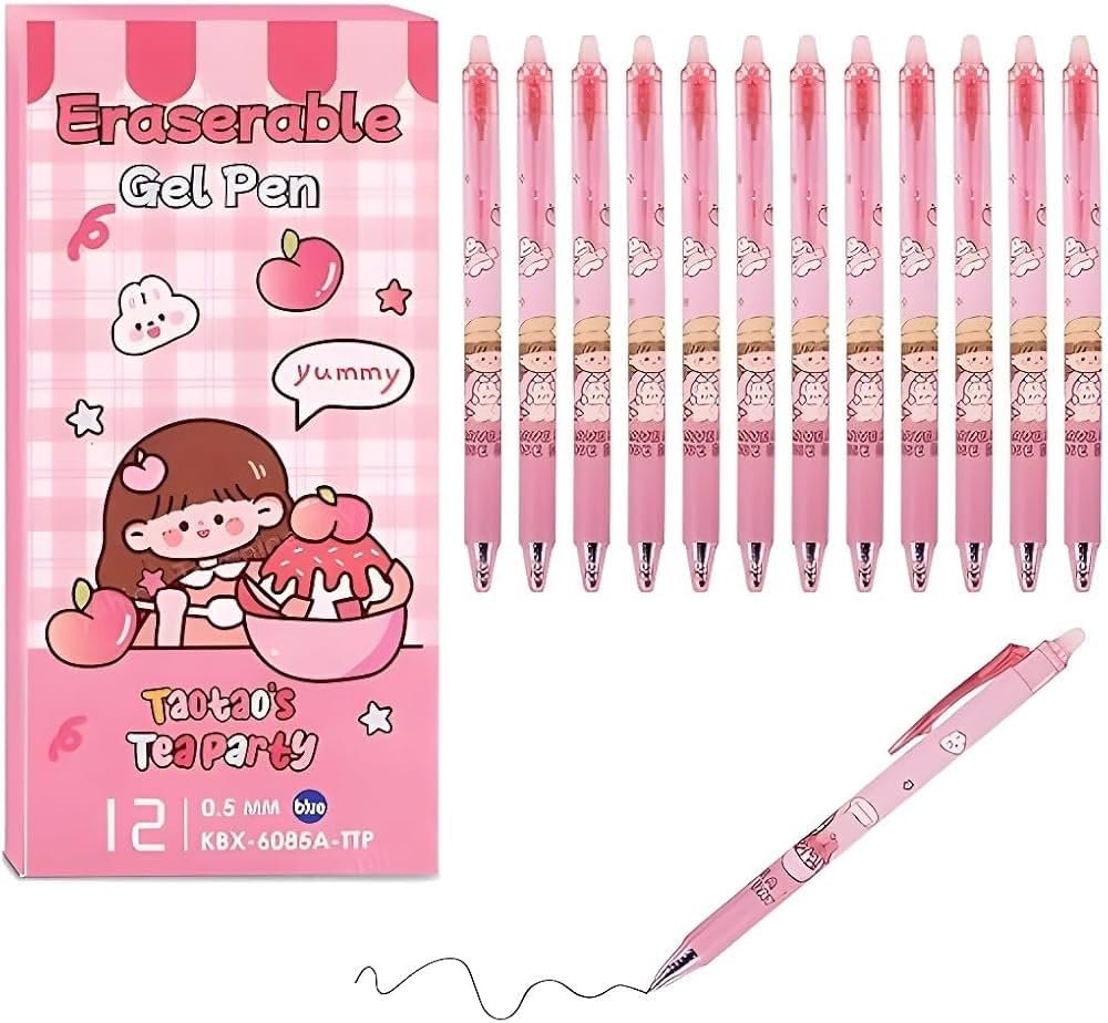 KRySt Retractable Gel Pens – 0.5 mm Smooth Writing Erasable Pens for Kids (Boys & Girls), Quick-Dry Blue Ink, School & Office Stationery Supplies, Pack of 12 (Kawaii Pens Pink)