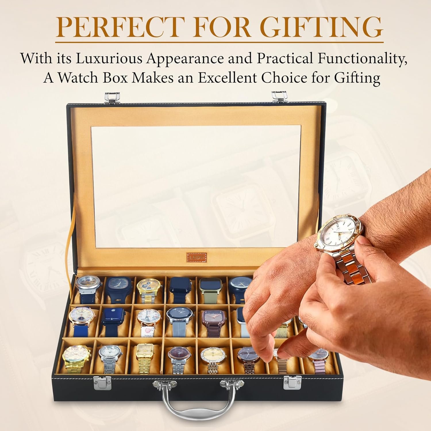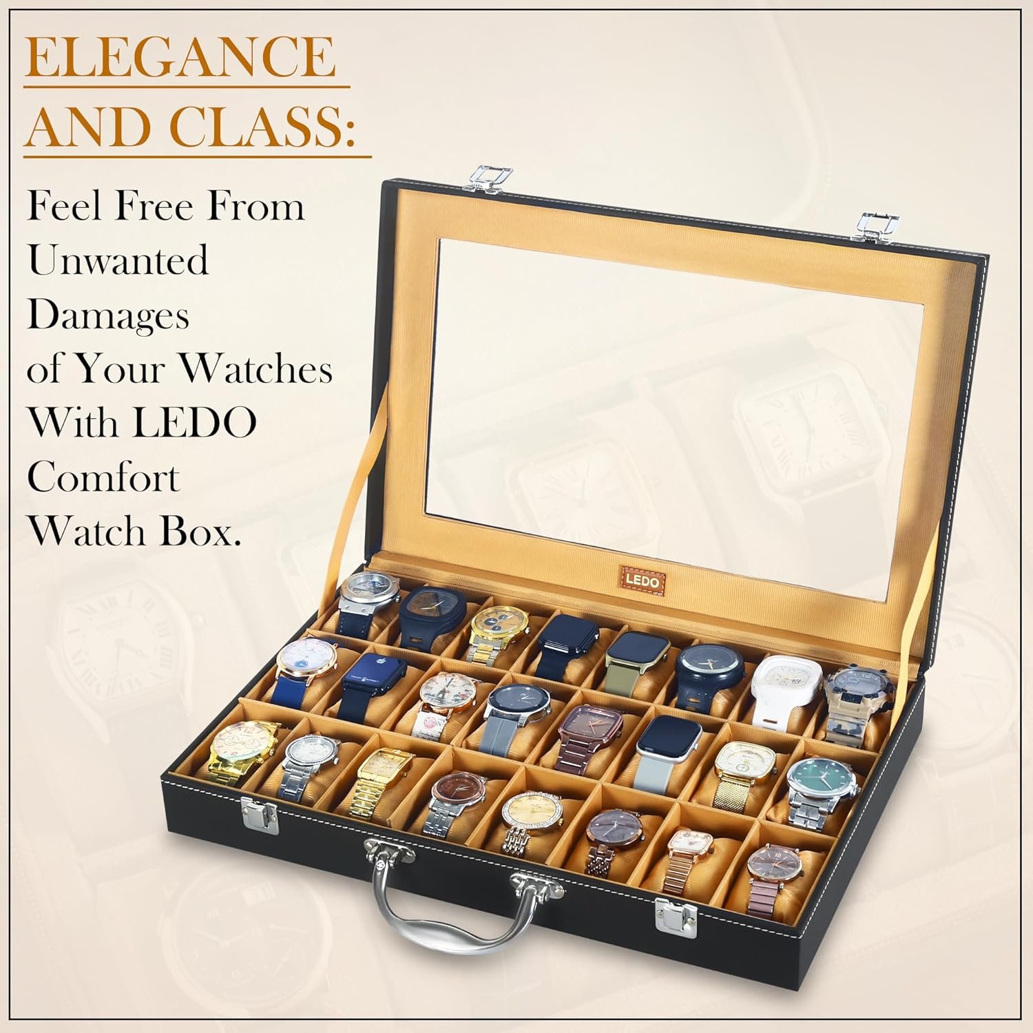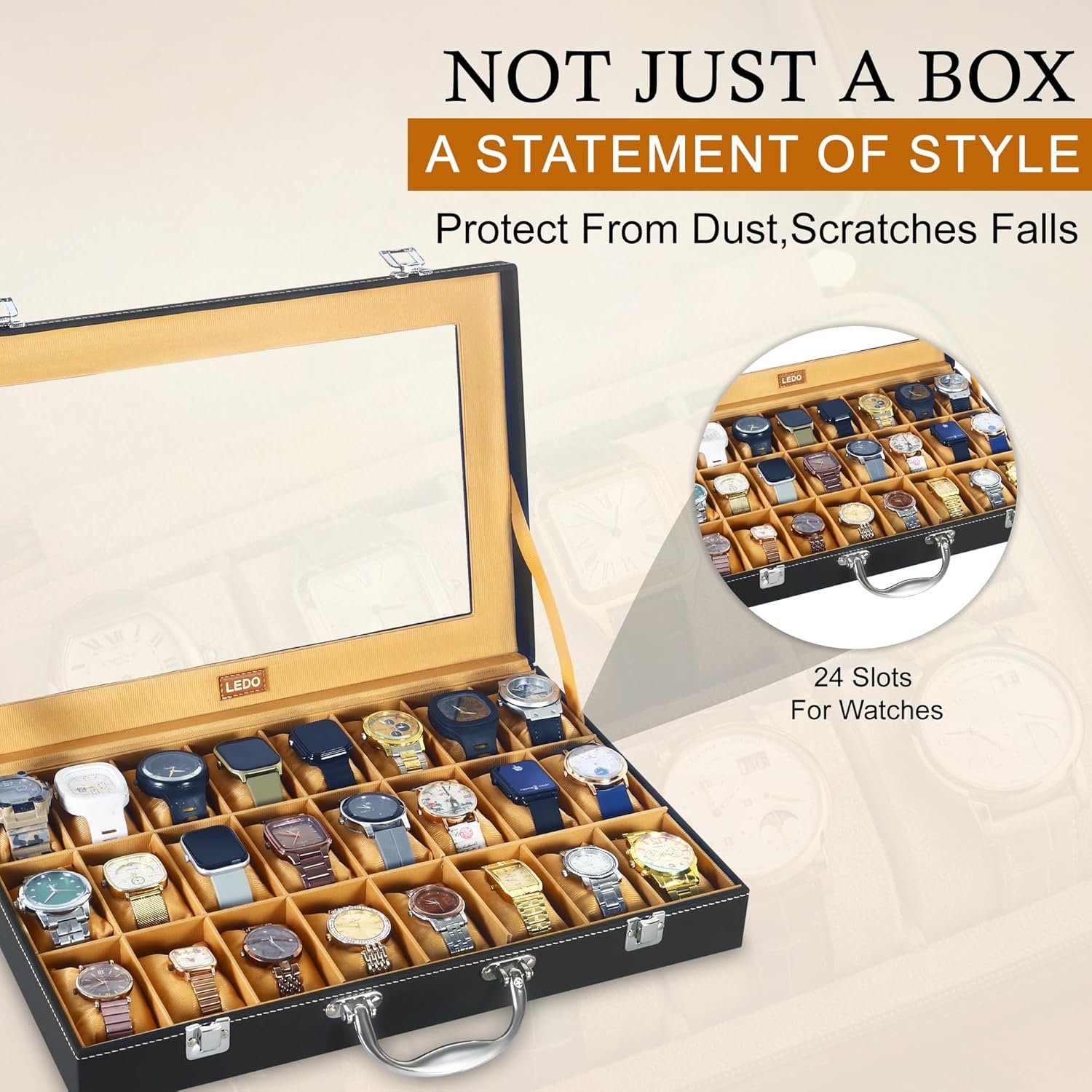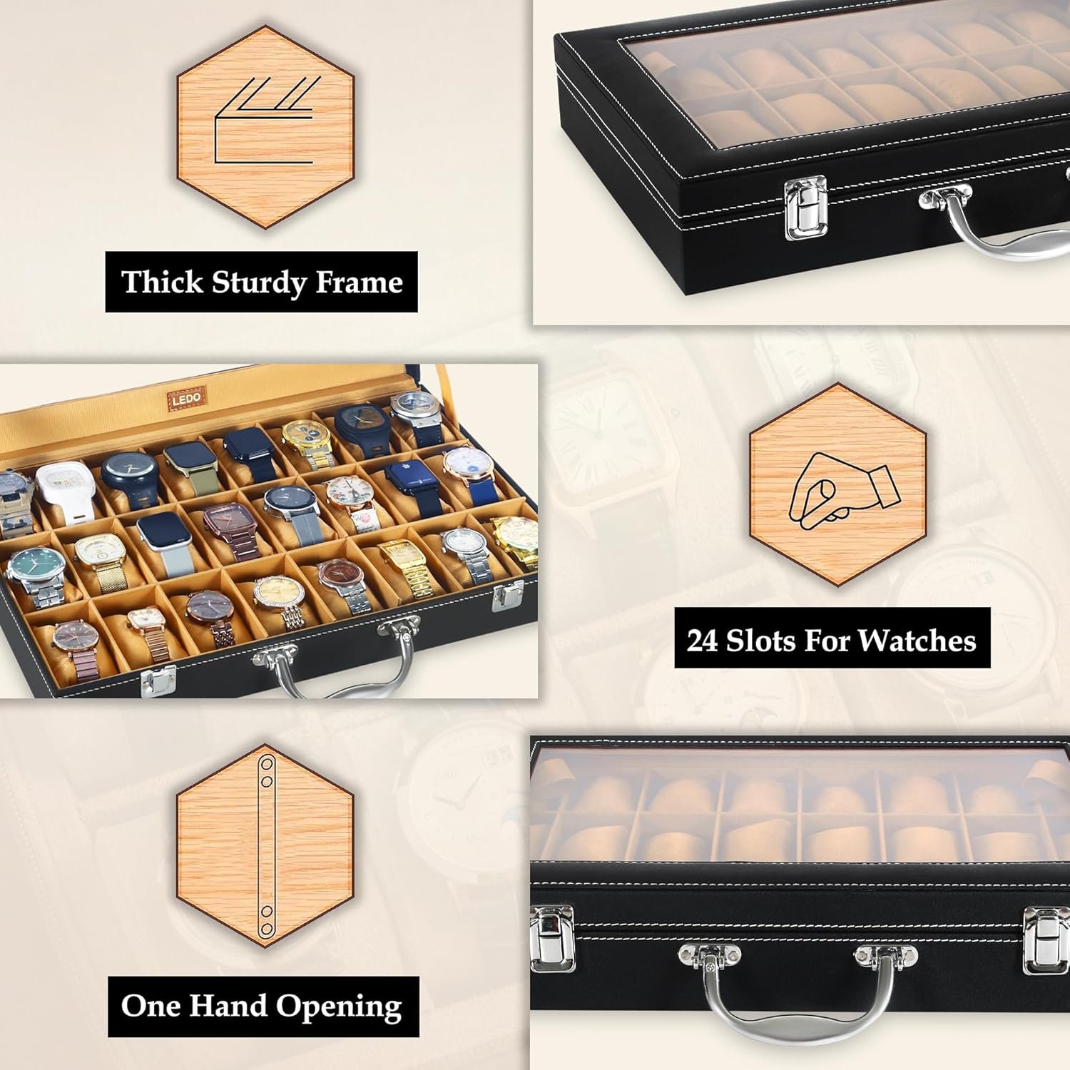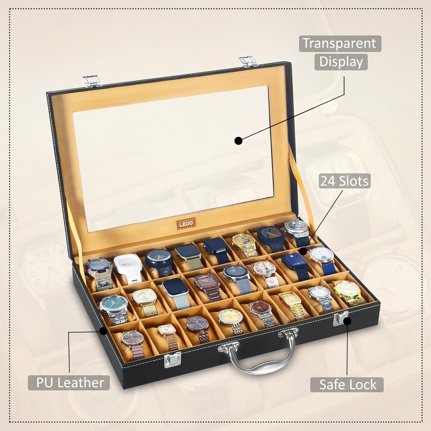 Be the first to review “LEDO Men’s and Women’s Watch Box Holder Organizer Case In 24 Slots of Watches In PU Leather with Black & Cream”