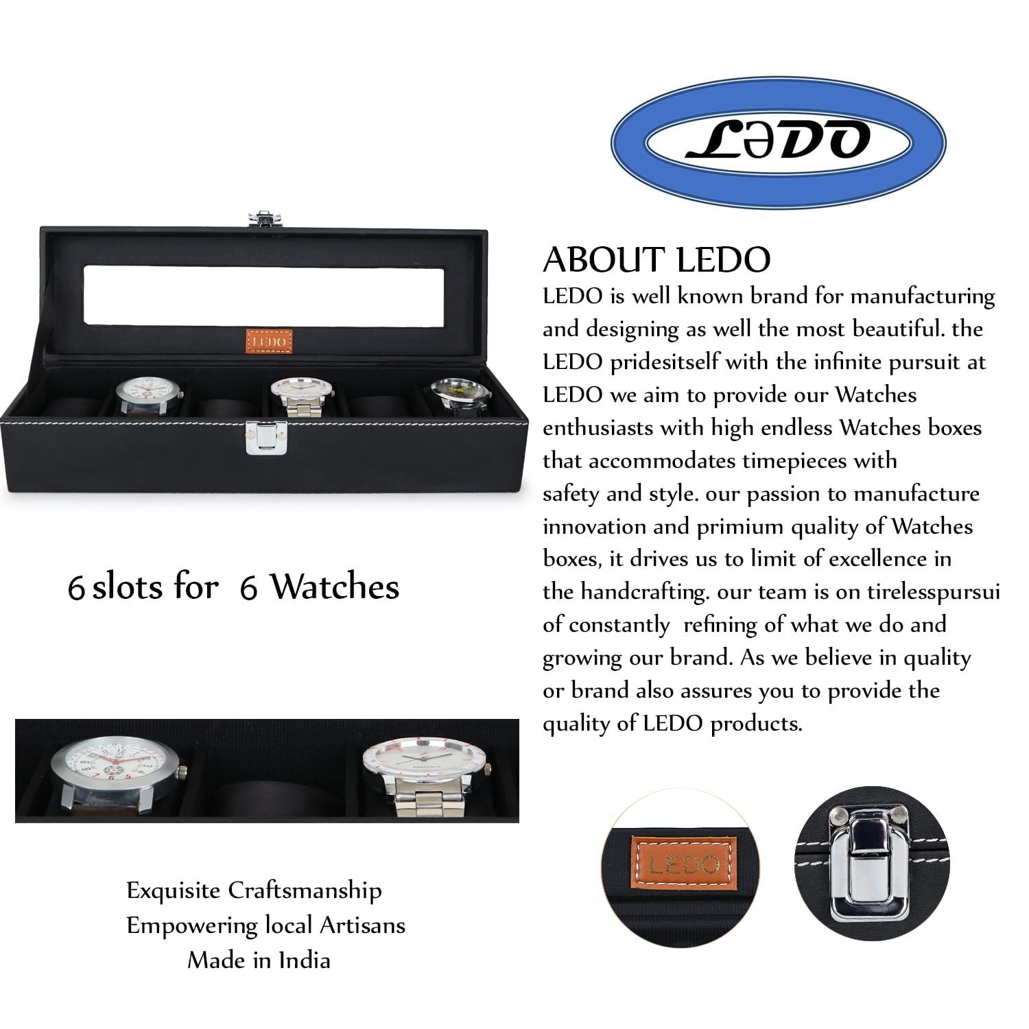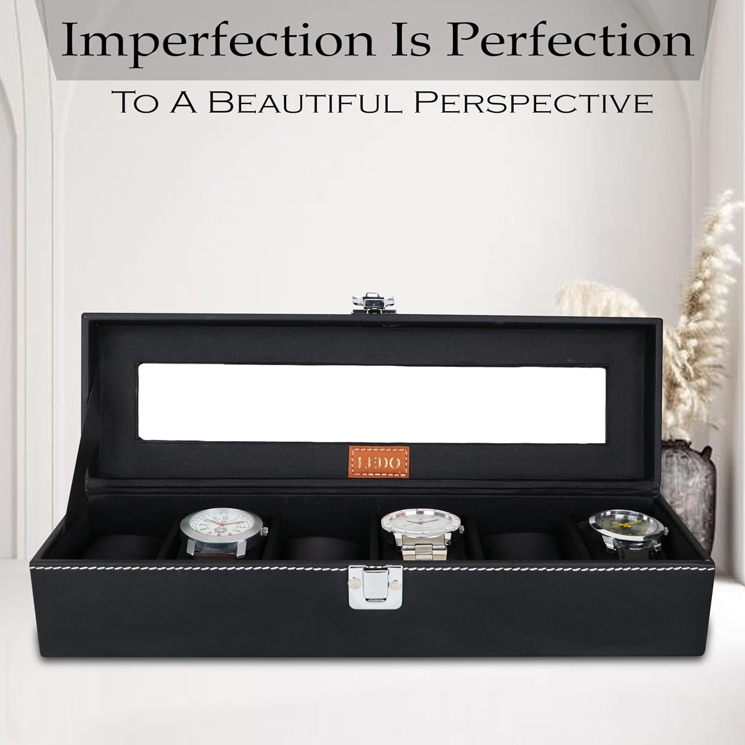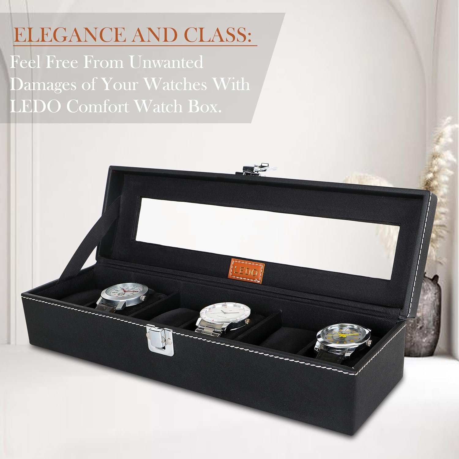 LEDO Watch Box Holder Organizer Case in 6 slots of Watches with Transparent Look Black color Velvet
