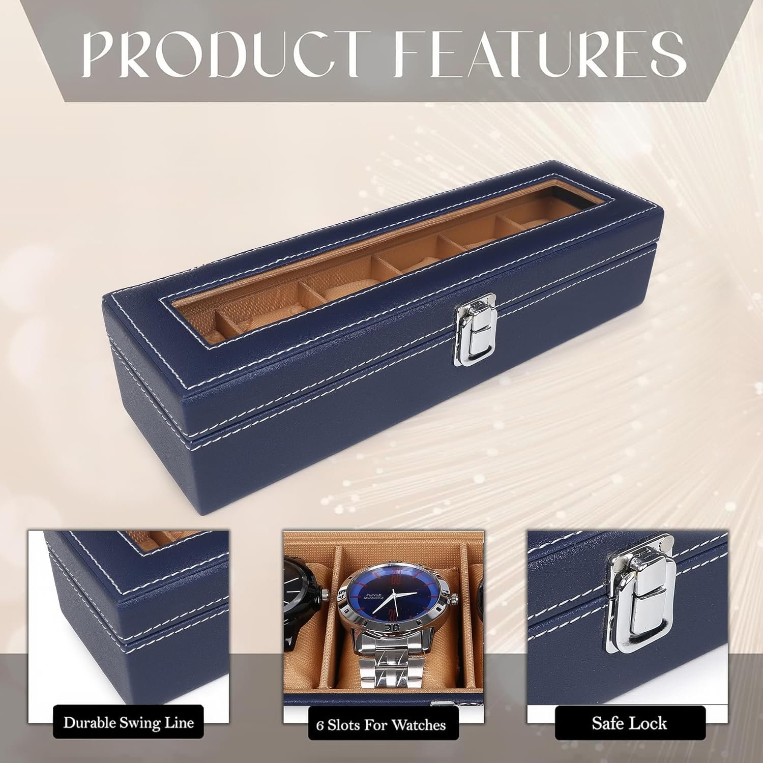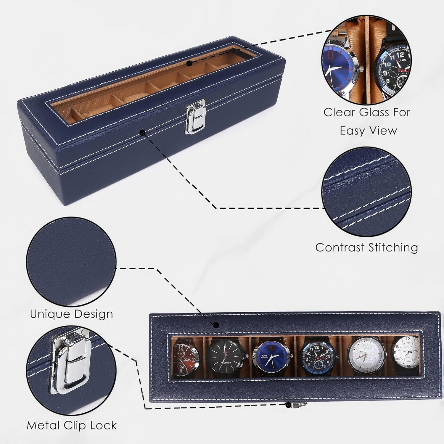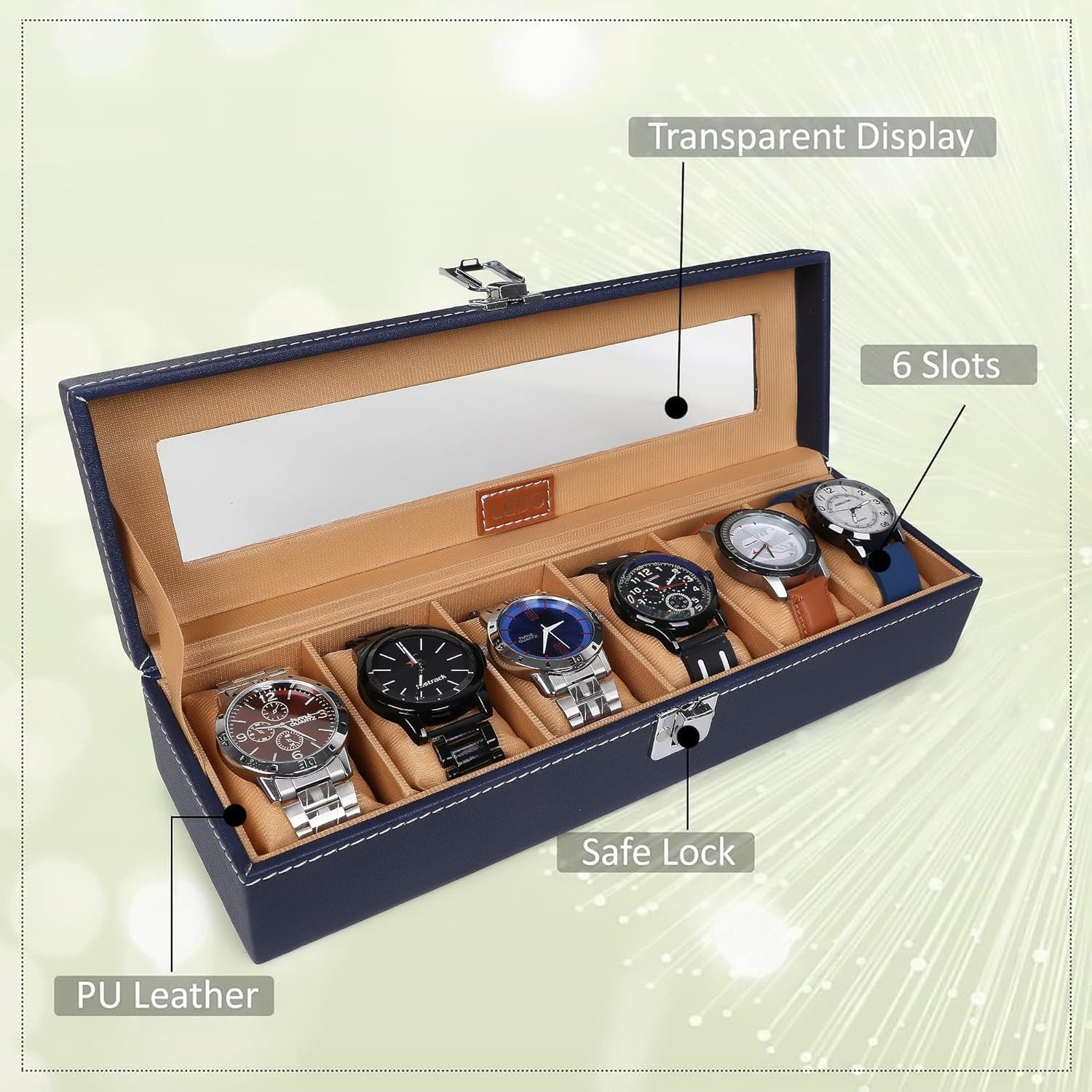 LEDO Watch Box Organizer Case with 6 Slots, Transparent Display, PU Leather Exterior, Blue & Cream Velvet Interior, Metal Clasp Lock, Rectangular Storage Case for Men
