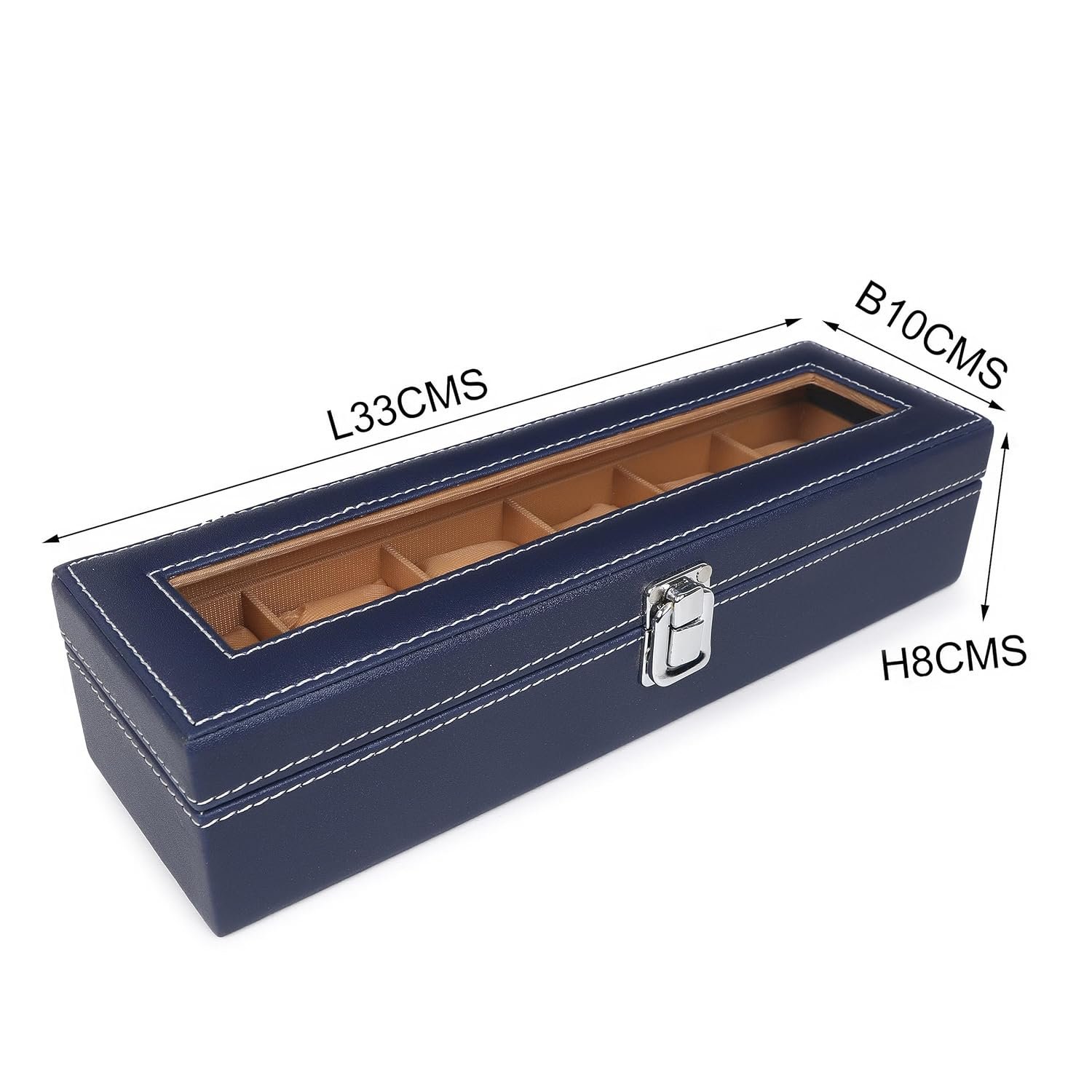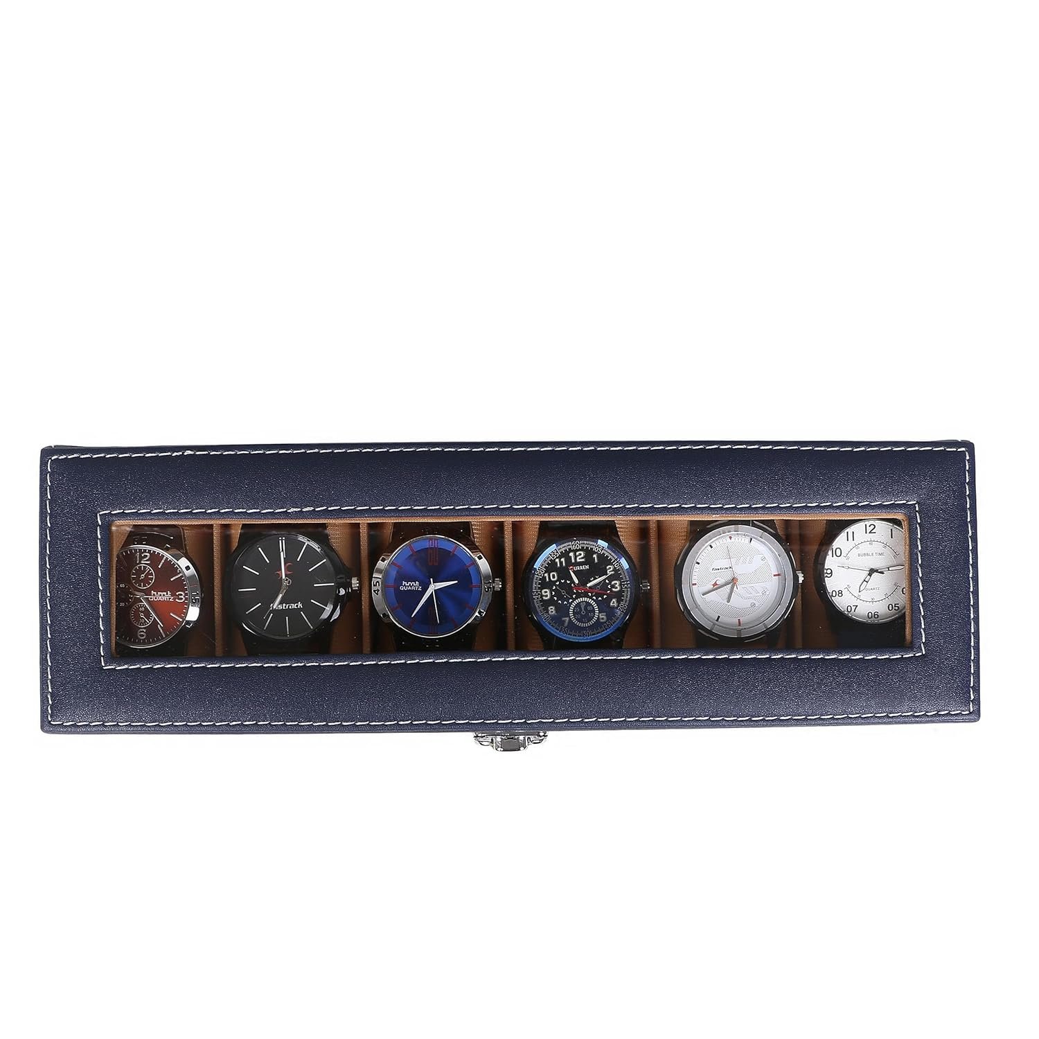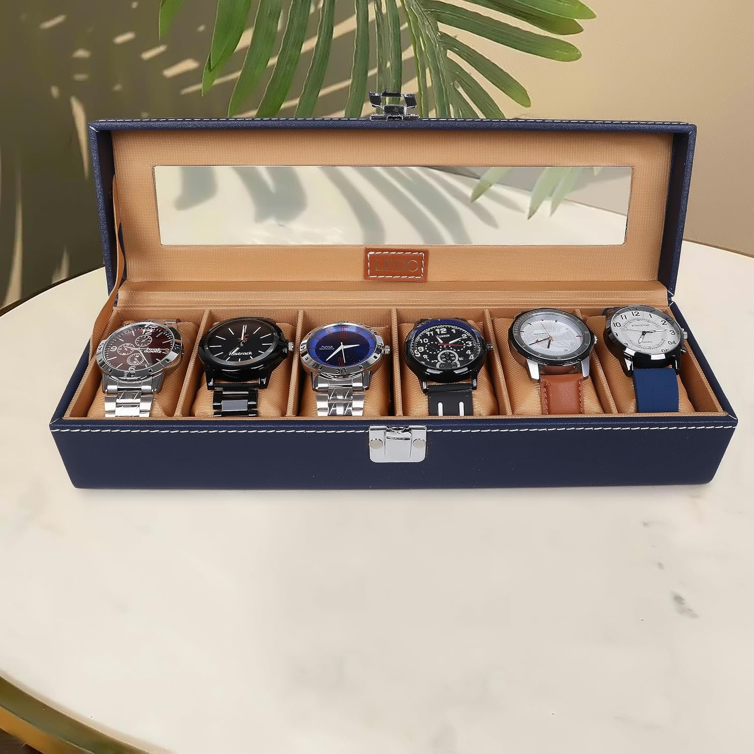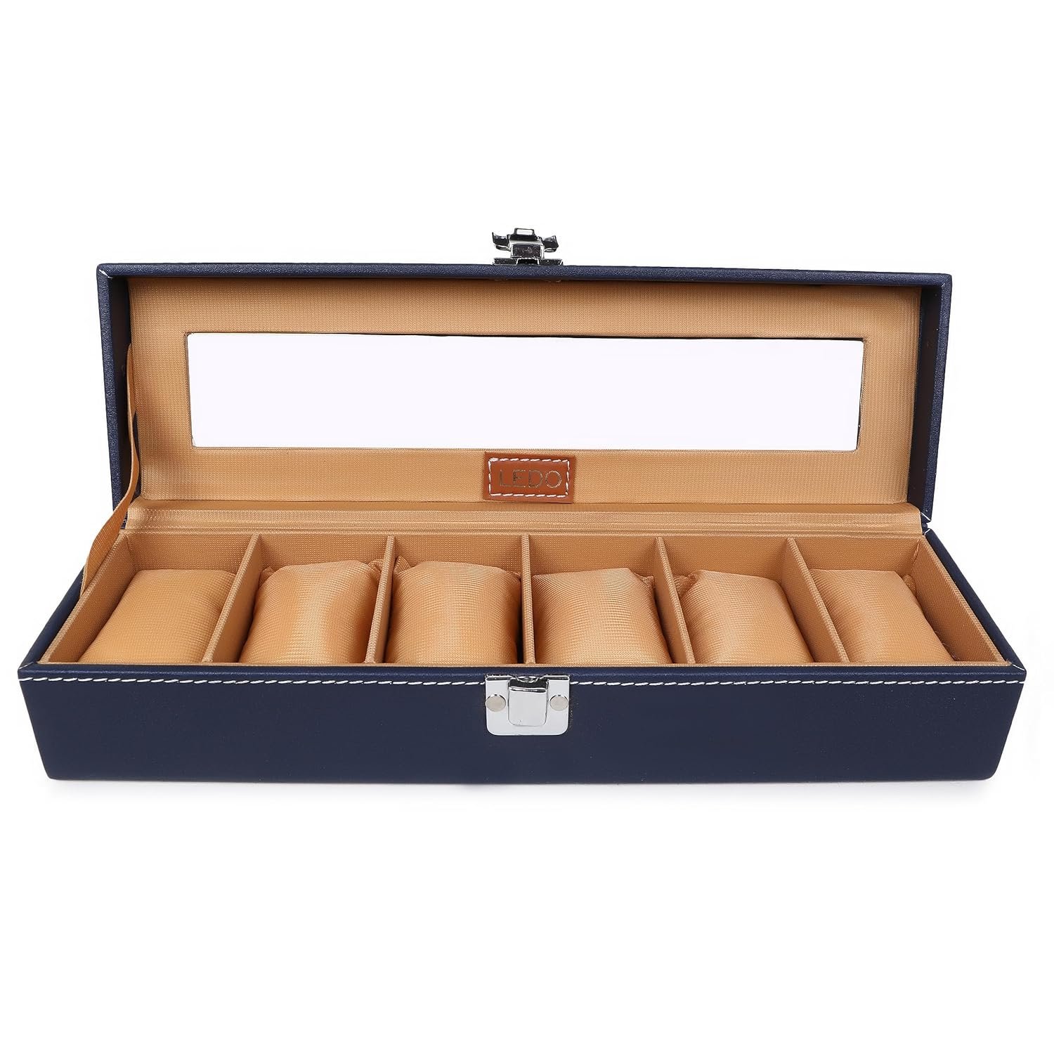 LEDO Watch Box Organizer Case with 6 Slots, Transparent Display, PU Leather Exterior, Blue & Cream Velvet Interior, Metal Clasp Lock, Rectangular Storage Case for Men