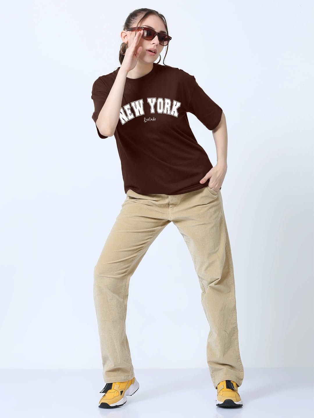 LEOTUDE Half Sleeve Cottonblend Oversized Tshirt for Women, Round Neck Longline Printed Drop Shoulder Baggie T-Shirt (Color Brown)