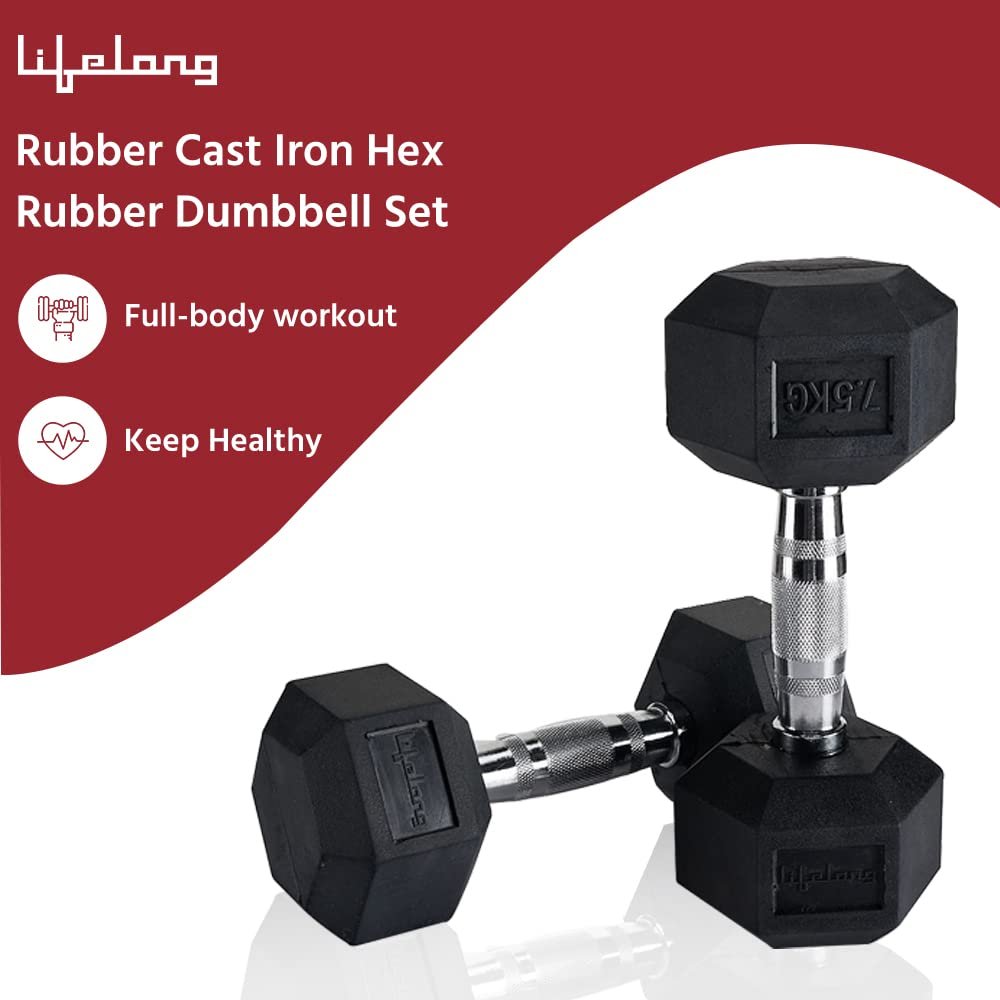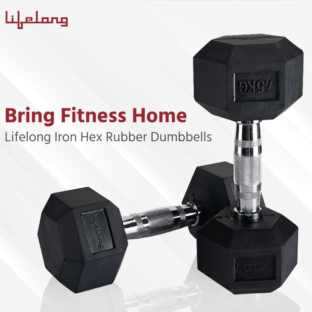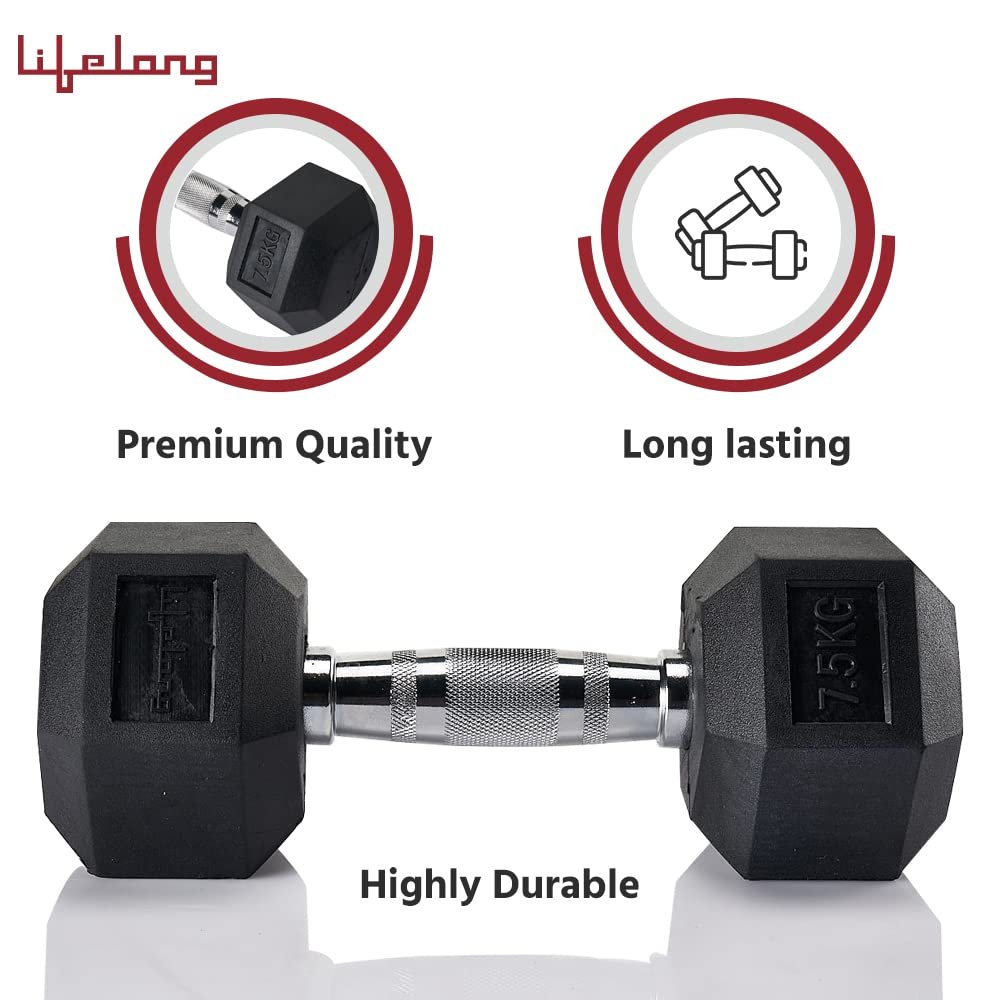 Lifelong Rubber Coated Hexa Dumbbell Set of 2 (7.5Kg x 2) for Home Gym – Weights for Men & Women – Exercise Equipment (Black)