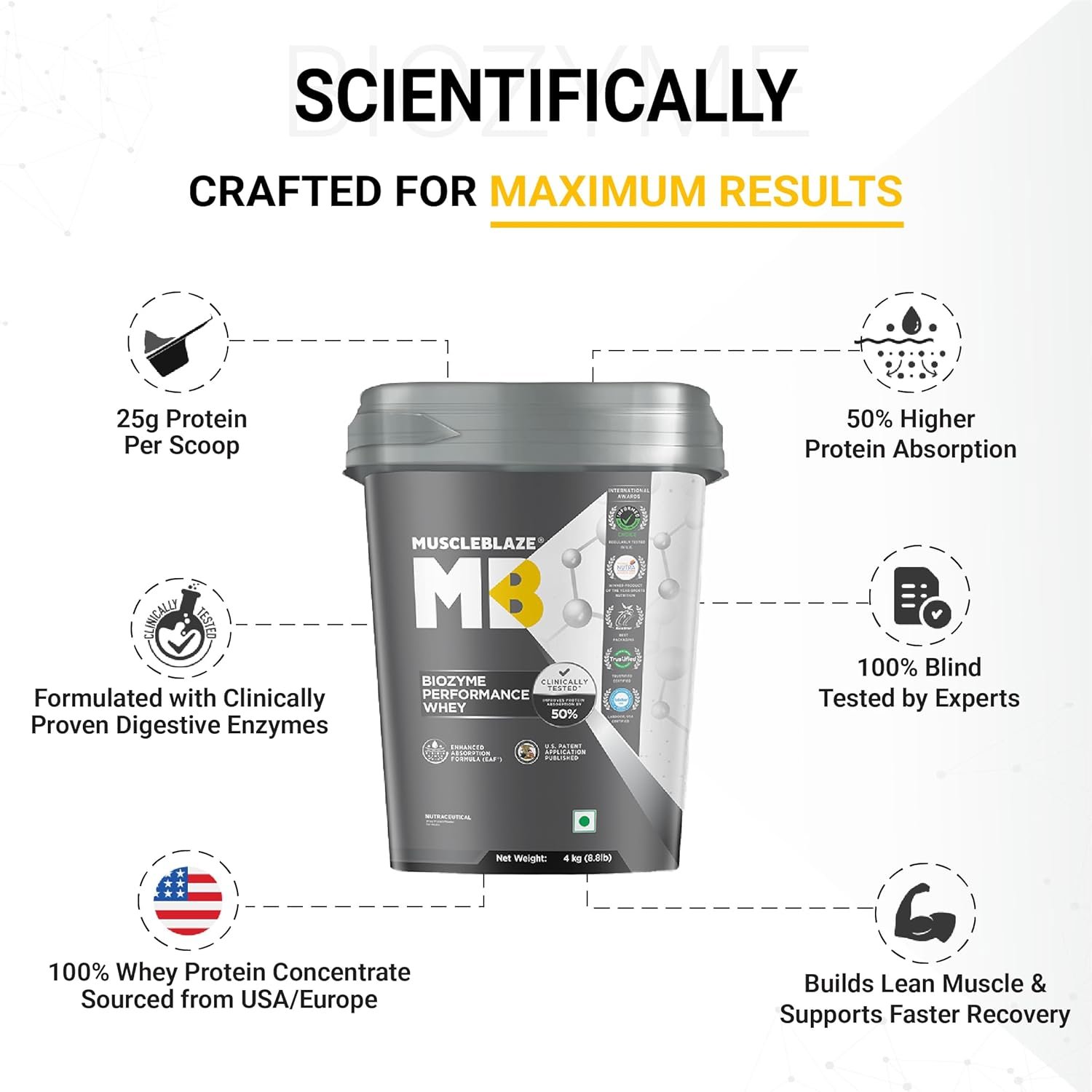 MuscleBlaze Biozyme Performance Whey Protein Powder, Blue Tokai Coffee (4kg / 8.8lbs) | 25g Protein Per Scoop | Clinically Tested 50% Higher Protein Absorption