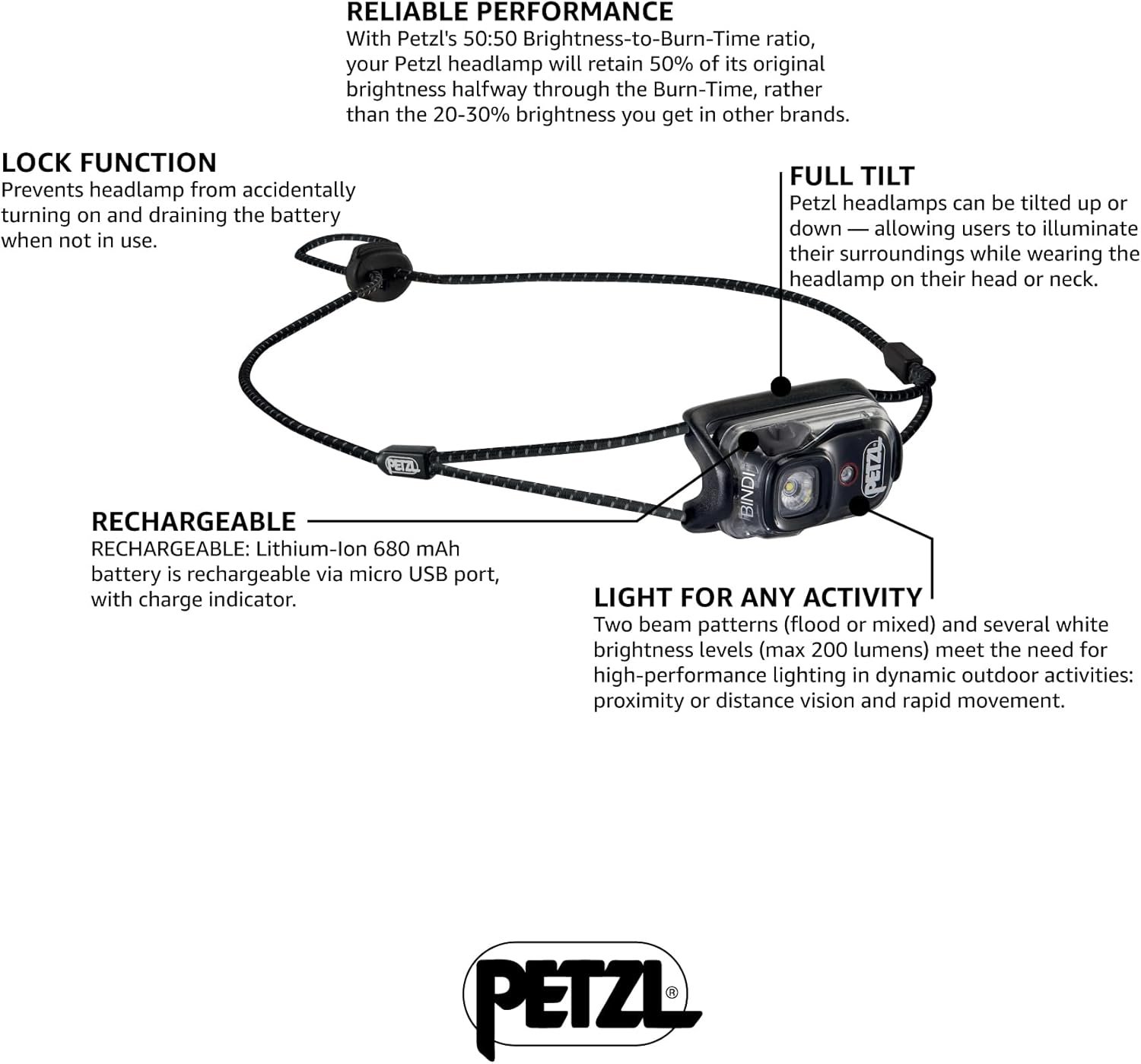 PETZL, Bindi Headlamp Black, Ultra-Compact Rechargeable headlamp Designed for Everyday Athletic Activities. 200 lumens