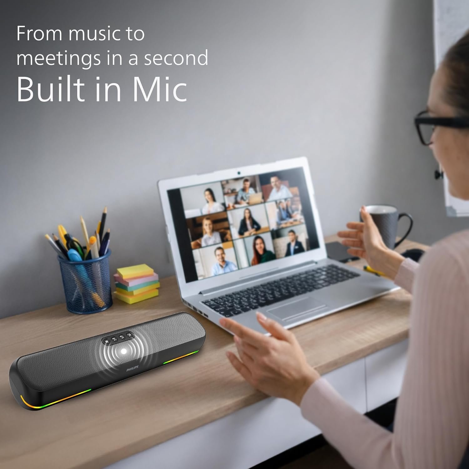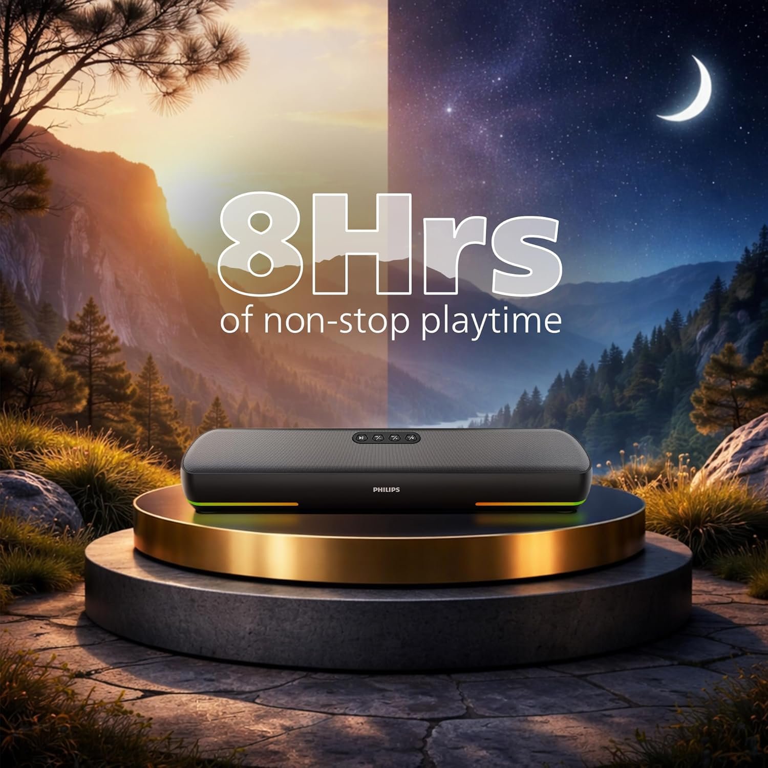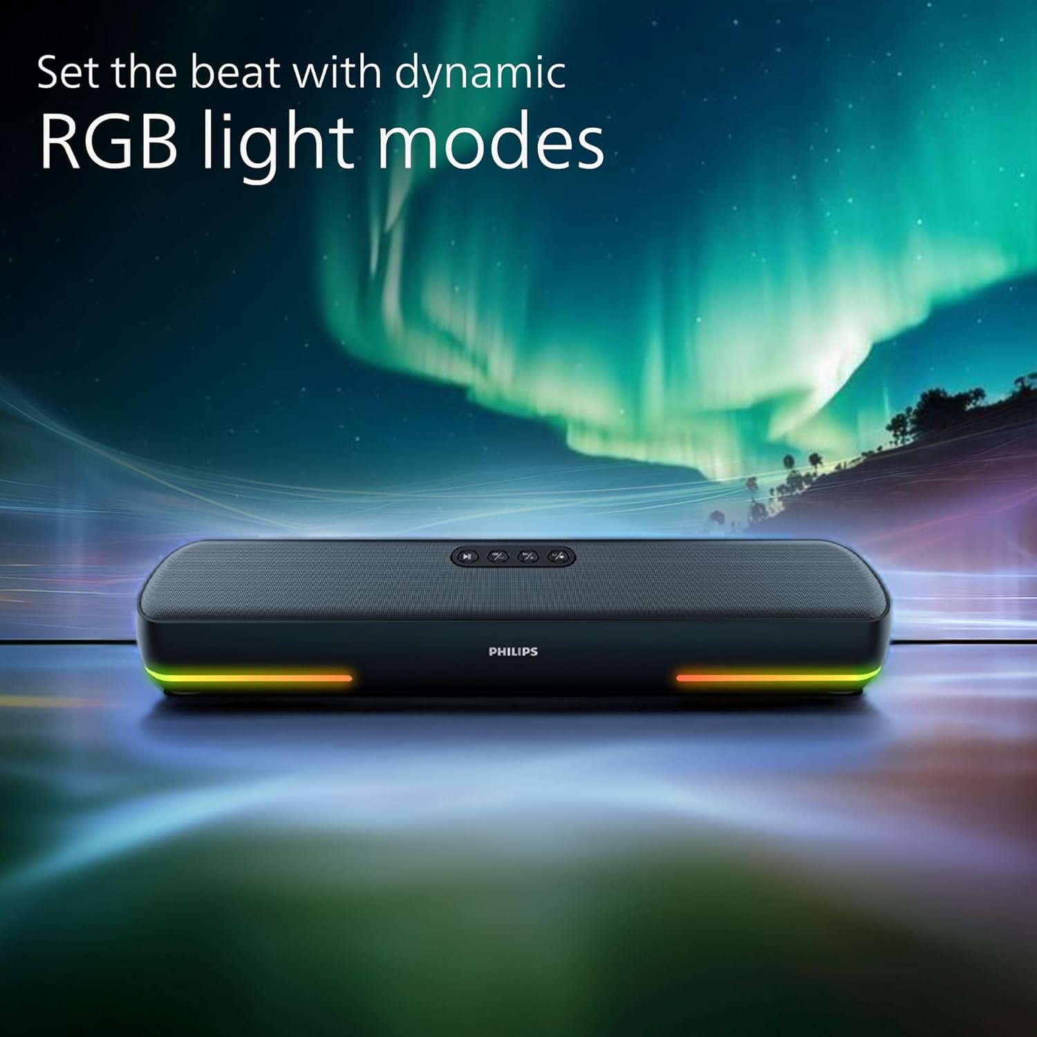 Philips TAB4120BK/94 Wireless Bluetooth Soundbar, 20W, 8H Playtime, Bluetooth 5.1, TWS Mode, RGB Light, LED Indicator, Built-in Mic, Voice Assistant, AUX/USB/TF card input, USB-C Charging (Deep Black)