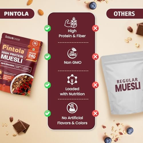 Pintola High Protein Muesli Dark Chocolate & Cranberry 1kg, 24g Protein, High Fibre, Trans Fat Free with Brown Sugar, Real Fruits, Muesli for Breakfast Food, Muselies Fruit Nuts and Seeds 1 kg