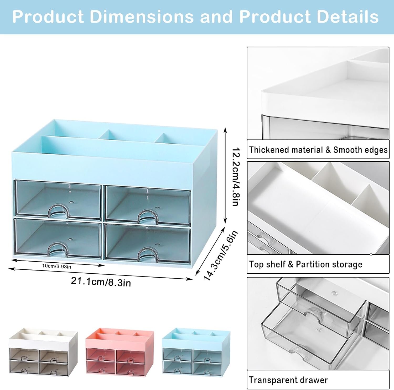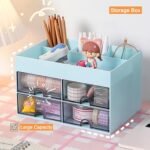 Plastic Multi-Functional Desk Organizer With 4 Compartments & 4 Drawer Desktop Office Supplies Stationery Storage Box Cosmetic Organizer For Pens Staplers Clips Sticky Notes (Blue)