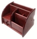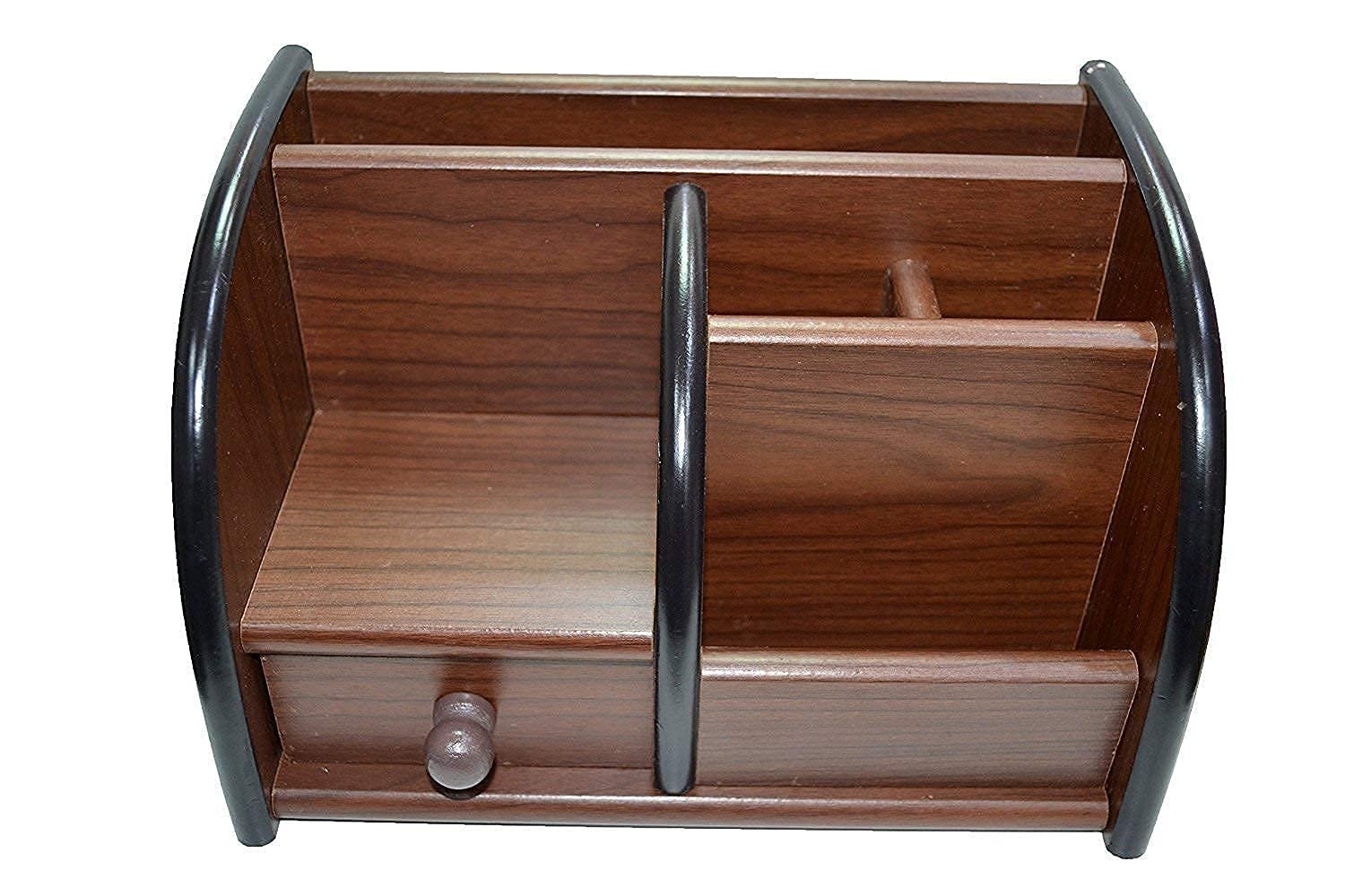 Polished Multi-Functional Wooden Desk Organiser, Pen Stand/Pencil Stand With Drawer, Stationery Stand For Office And Students Use – Mobile Holder For Desk, Brown
