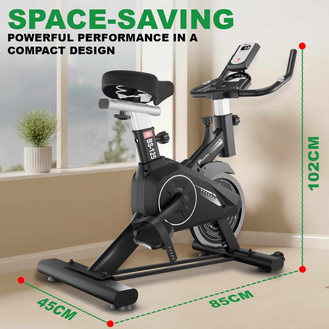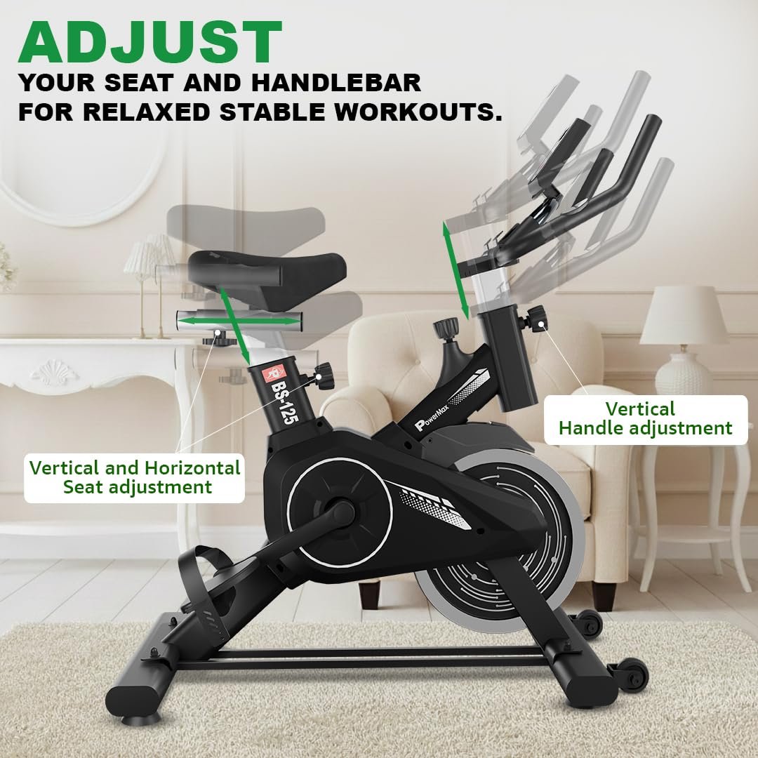 PowerMax Fitness BS-125 Spin Exercise Bike For Home Use,16Mm 6Kg Flywheel,Max User Weight 130Kg,LCD Display,2Pc Crank,Heart Rate Sensor,Knob Braking,Adjustable Foot Strap And Seat,Ipad Holder,Black