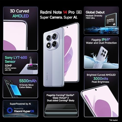 Redmi Note 14 Pro 5G Phantom Purple 8GB RAM 256GB Storage|50 MP Sony Camera Setup|Corning Gorilla Glass Victus 2 | 1.5K 3D Curved AMOLED | Mediatek Dimensity 7300- Ultra
