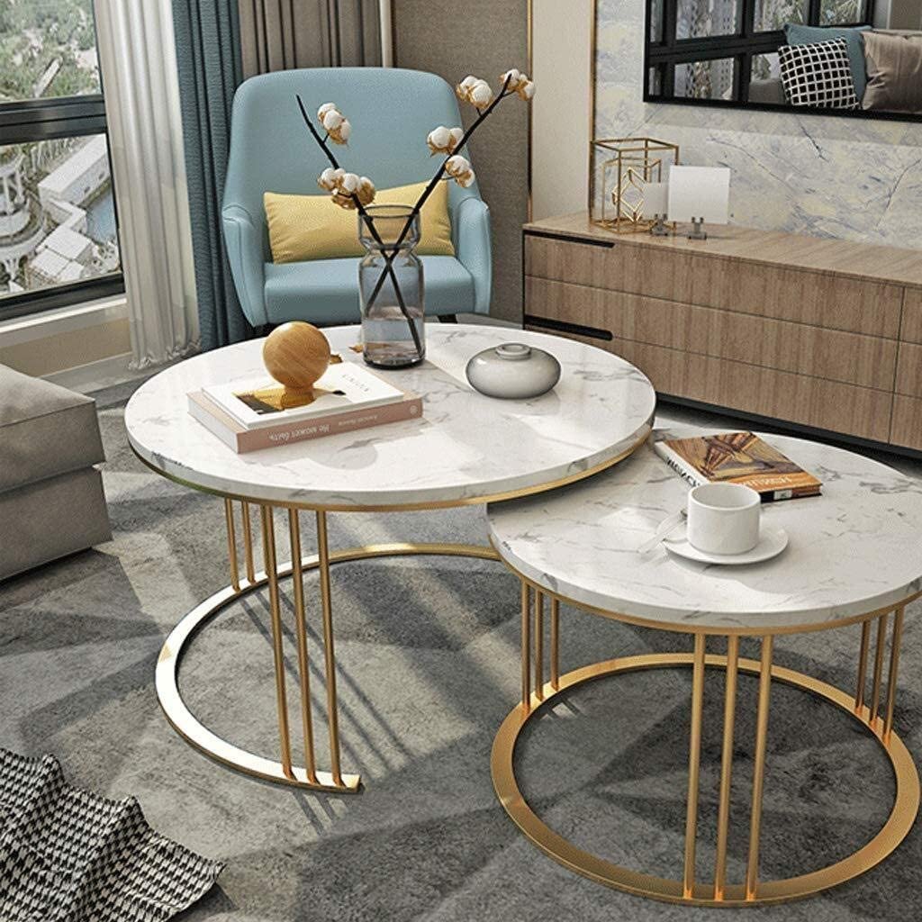 Round Side Tables, Modern Coffee Table with Marble Laminated Top, 2 Nesting Table Set with Storage Open Shelf for Living Room Modern Minimalist Style Furniture (Gold & White)