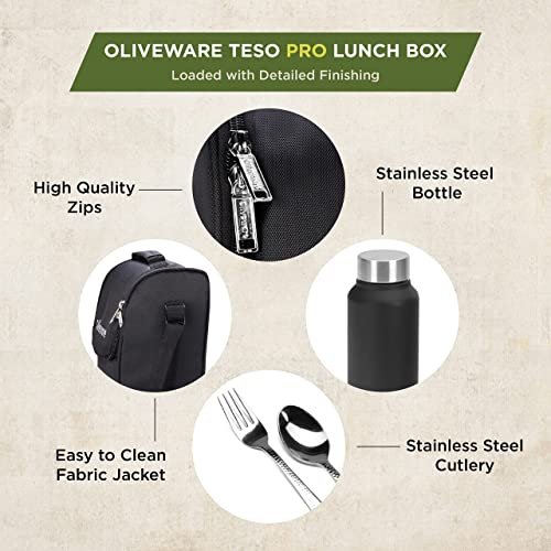 SOPL-OLIVEWARE Teso Pro Lunch Box with Steel Cutlery,3 Microwave Safe Inner Containers with Bpa Free Lids(290Ml,450Ml&600Ml) Plastic Pickle Box(130Ml) Steel Water Bottle(750Ml)-Black,600 ML