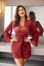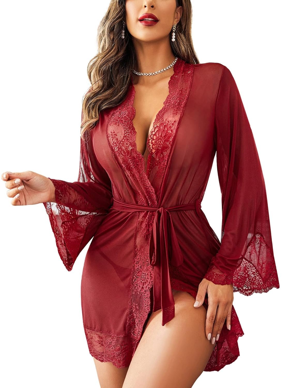 SSoShHub Women Lace Kimono Robe Babydoll Lingerie Mesh Chemise Nightgown Cover Up Robe with Panty