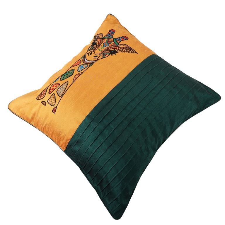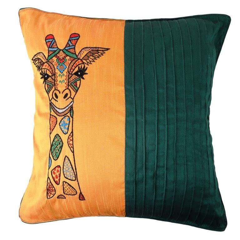 Teal Green & Golden Yellow Dupion Silk Cushion Cover, Hand-Embroidered Giraffe Face Design, Chain Stitch & Kantha Work. Perfect for Home Furnishing, Décor, Gifting, Corporate, and Festive Décor