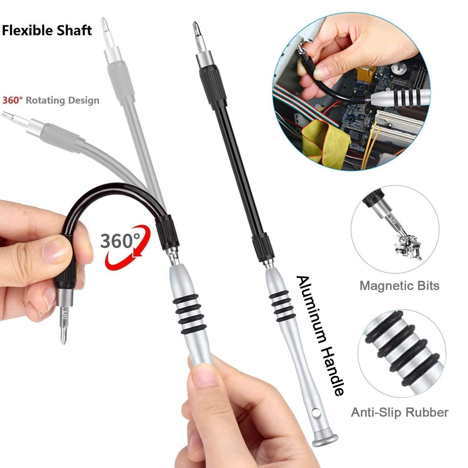【12 Electronics Repair Tool Accessories】 Small screwdrivers set available in soft and hard extensions for narrow corners. It is also equipped with antistatic tweezers and non-slip silicone handles for all types of occasions.
