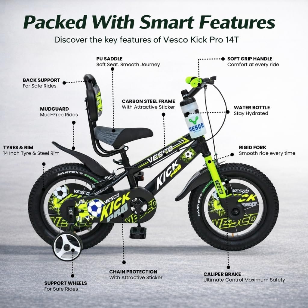 VESCO Kick Pro 14 T Kids Cycle with Balance Wheel & Back Rest Seat/Water Bottle | Rigid Fork, Frame 9 Inch | Ideal for 3 to 5 Years Boys & Girls (Green)