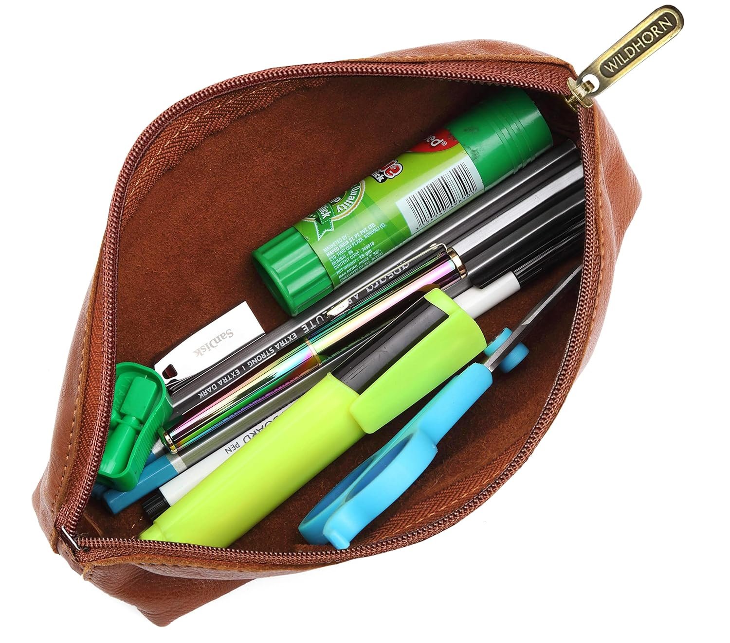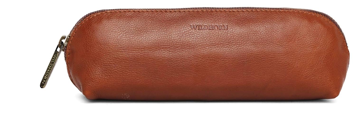 WildHorn Leather Leather Stationery Stylish Simple Pencil Bag Durable Compact Zipper Pencil Utility Case Pouch (Tan), Brown