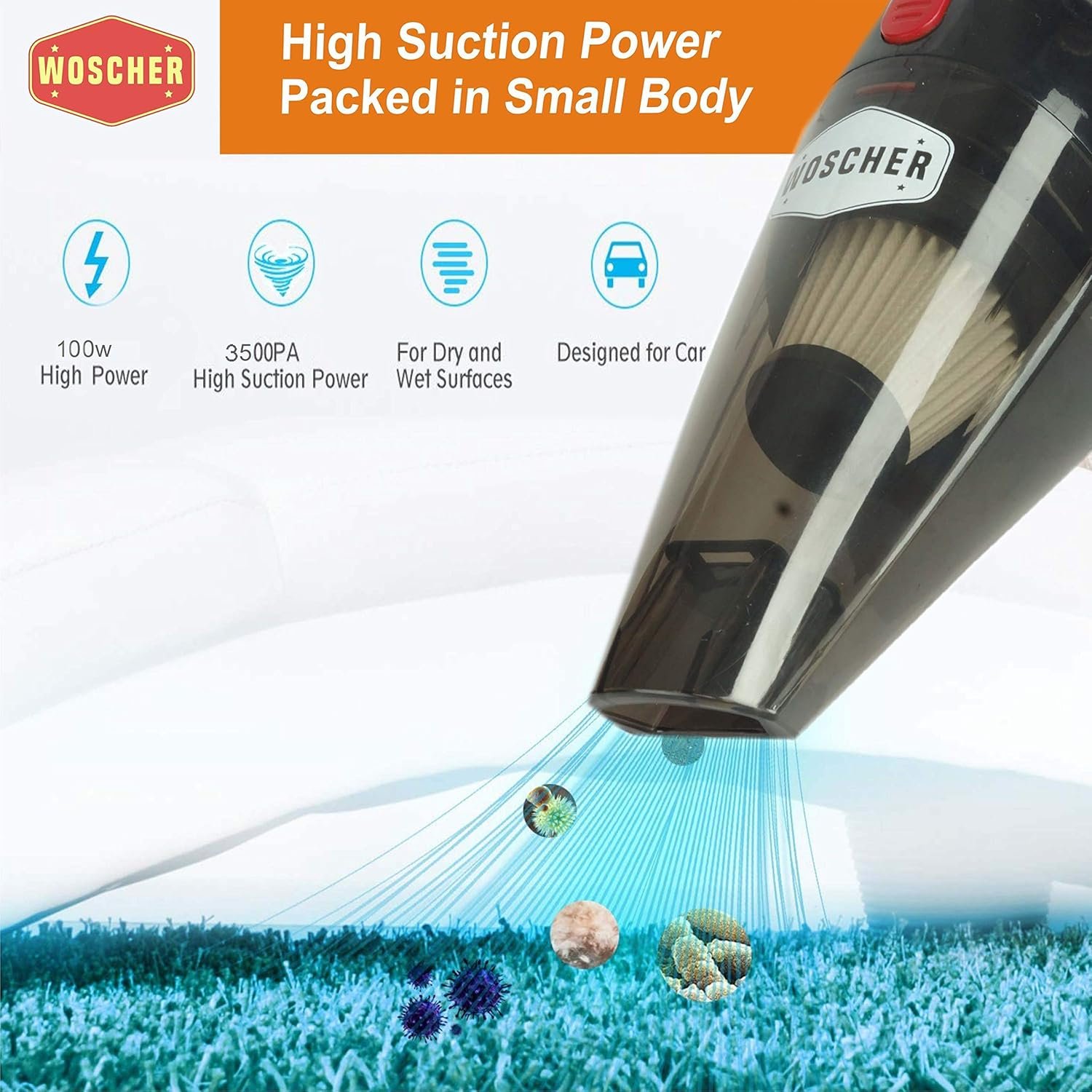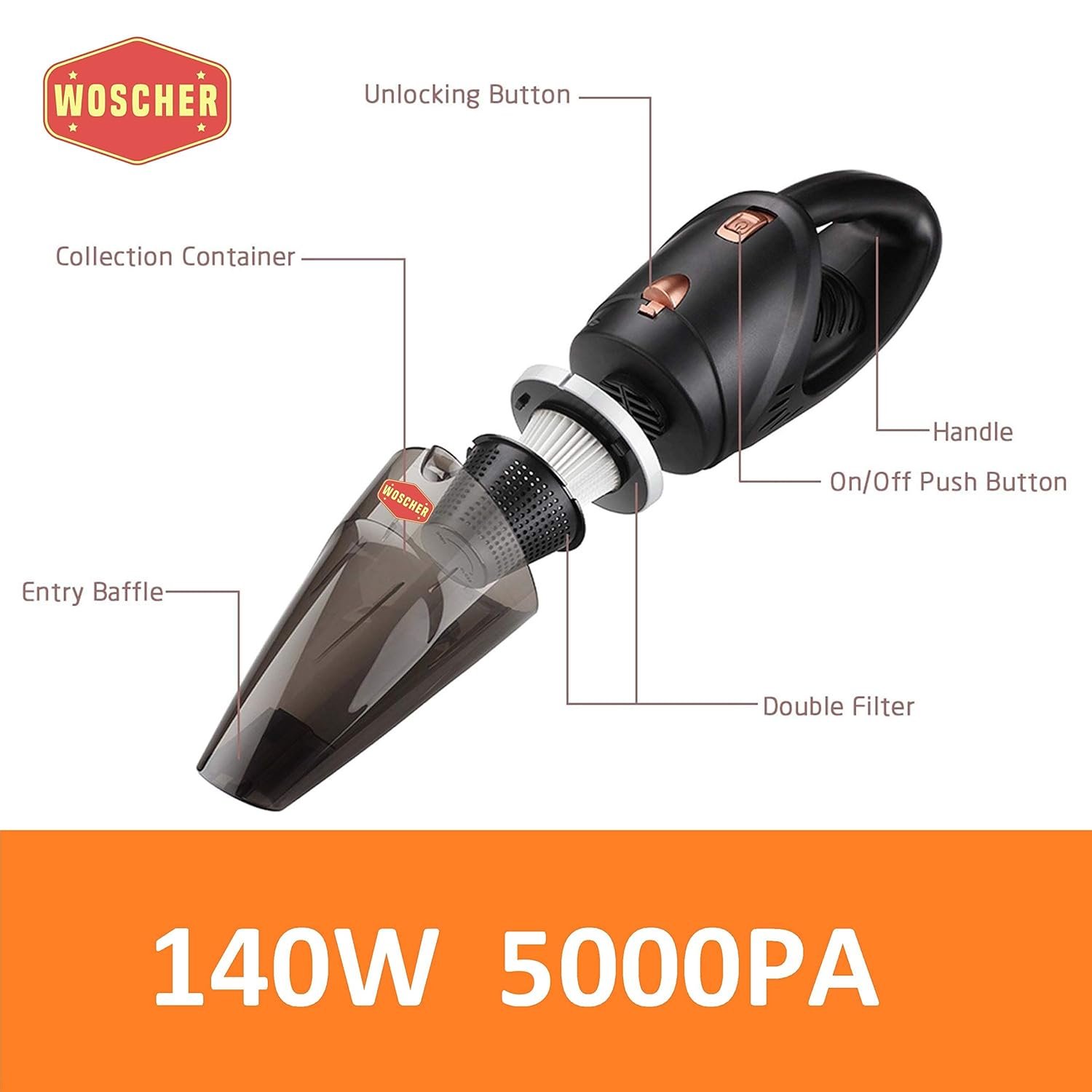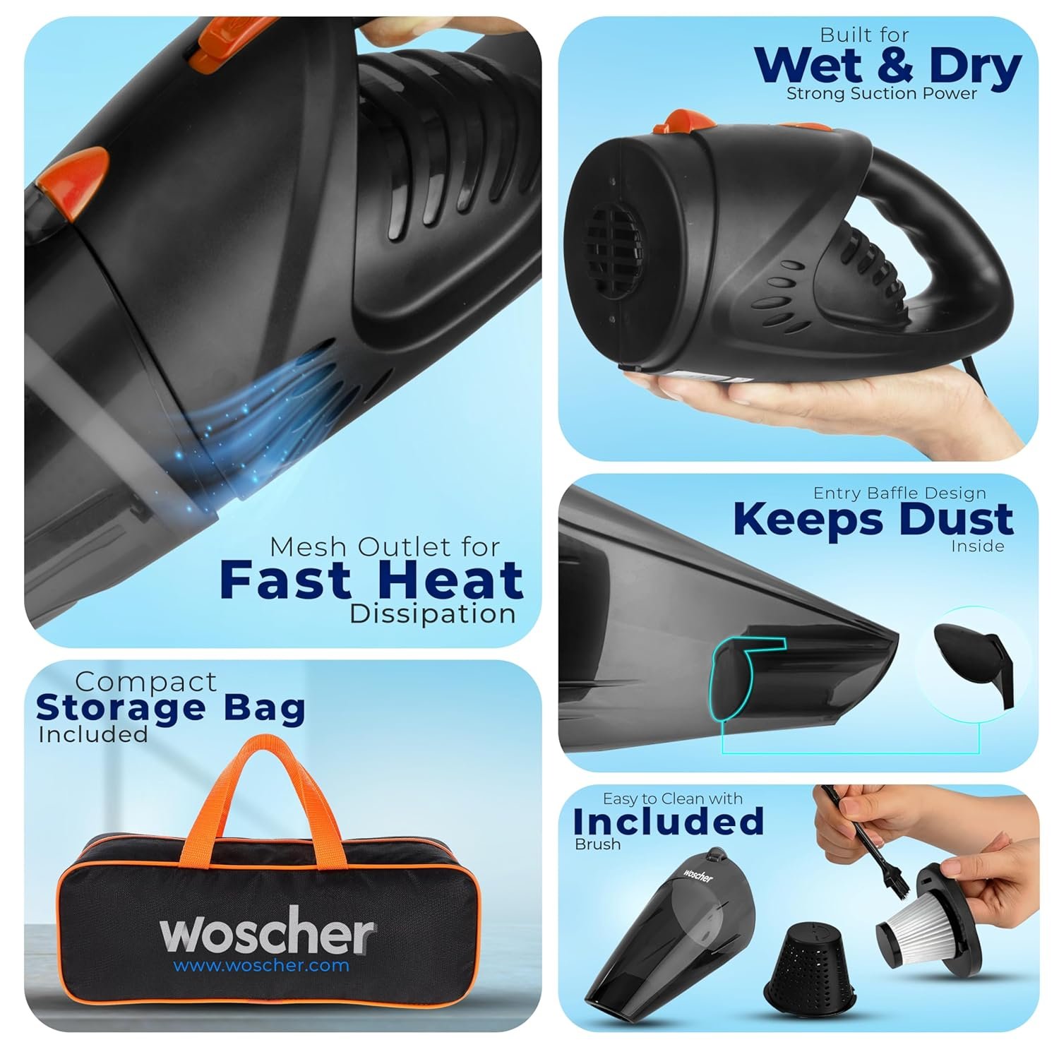 WOSCHER AutoVac Pro High Power Auto Car Vacuum Cleaner for Deep Cleaning, Hand Held Portable Car Vacuum with DC 12V, 140W Vacuum Motor & Powerful Suction 5000PA, Black