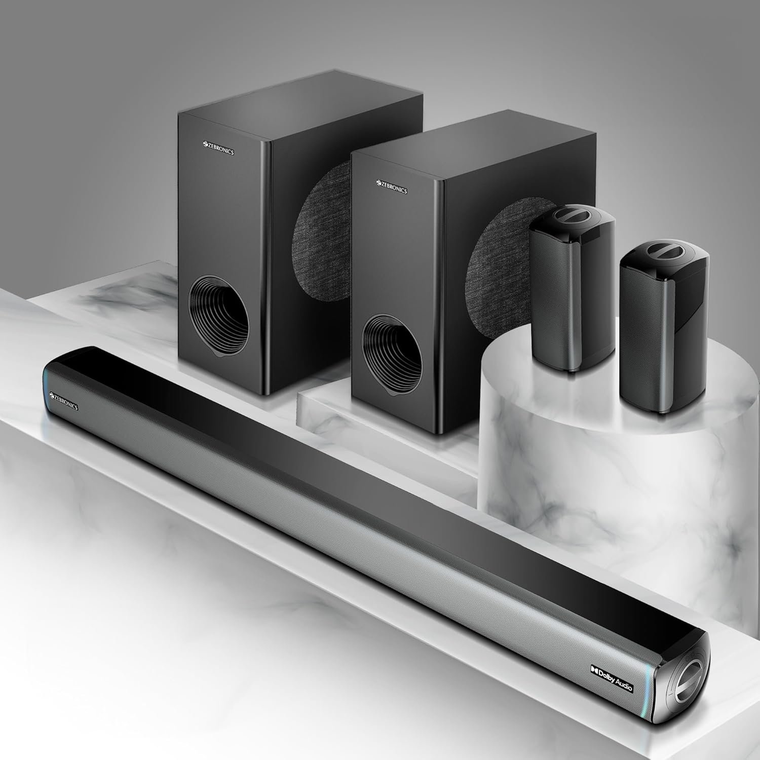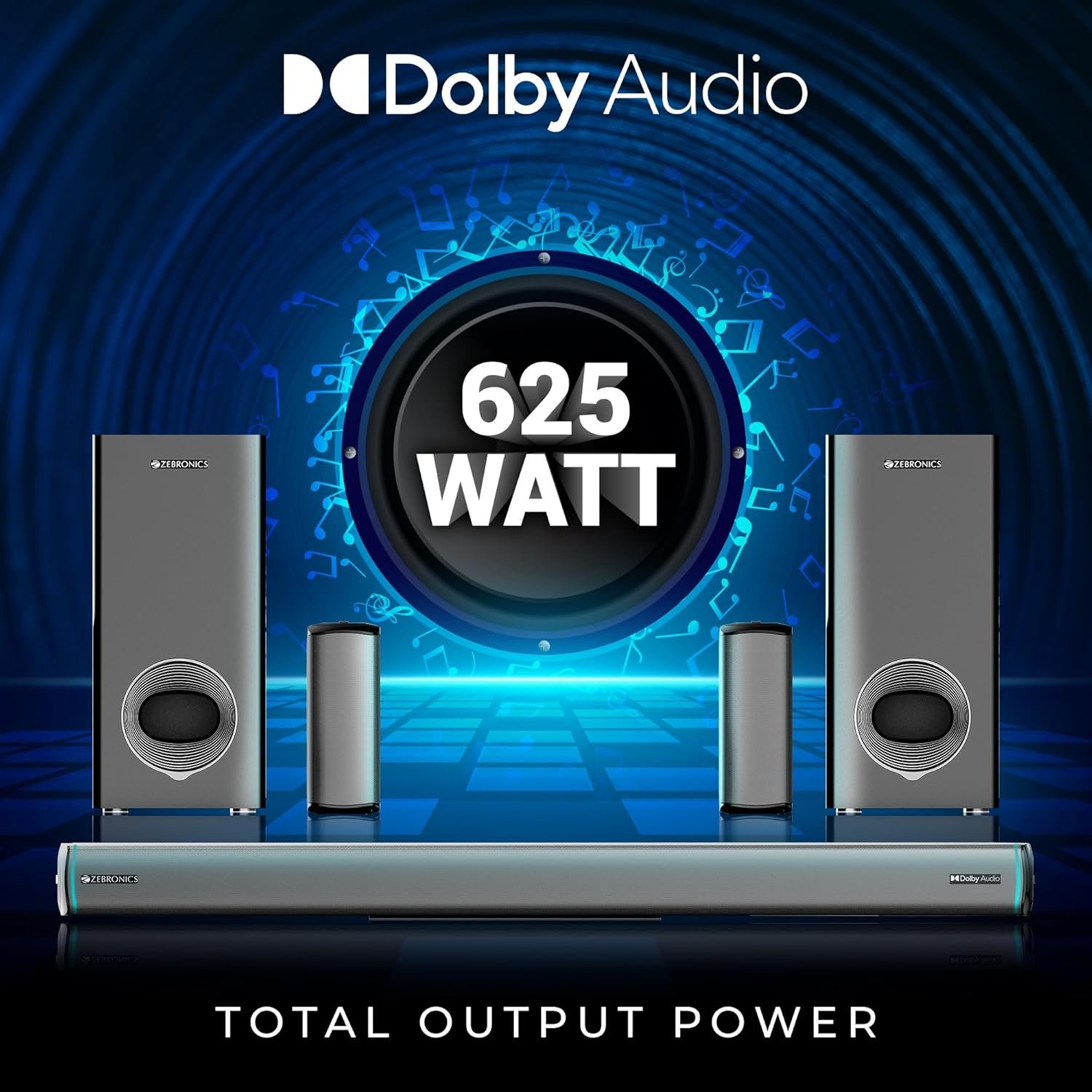 ZEBRONICS Juke bar 9550 pro 5.2 Soundbar (625 Watts), Dolby Audio, Dual Wireless Subwoofer & Wired Satellite, BT v5.3, HDMI ARC, Optical, Powerful Bass, RGB LED Lights, Wall Mountable, Silver