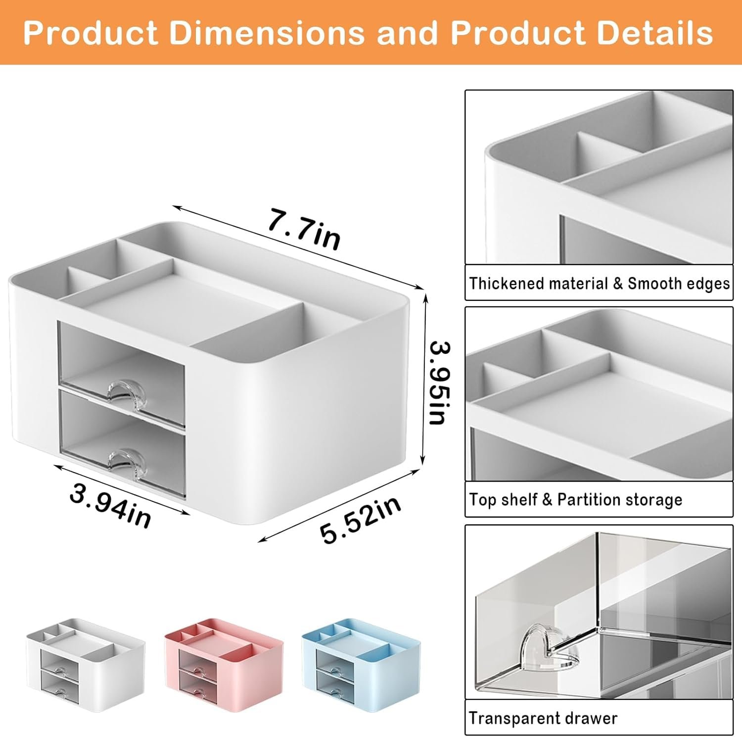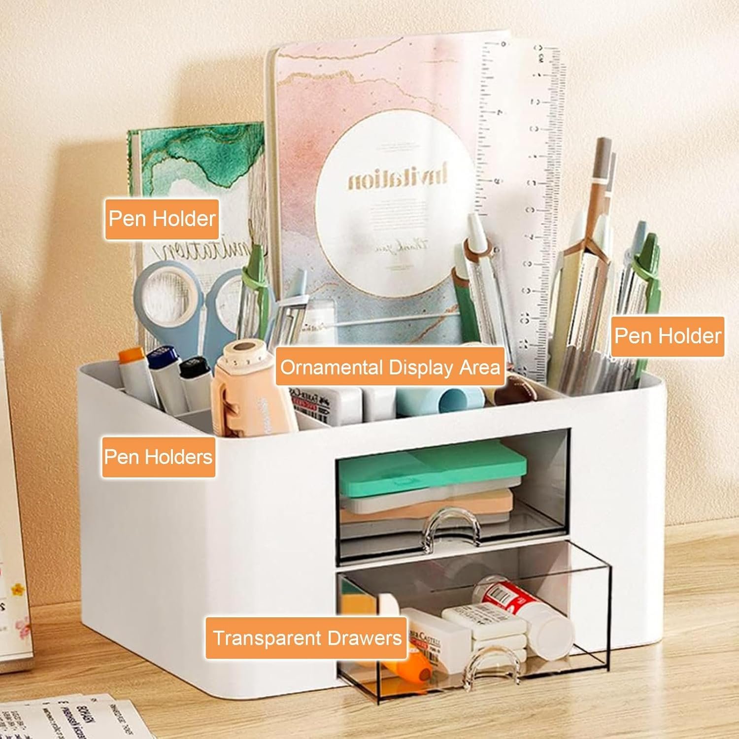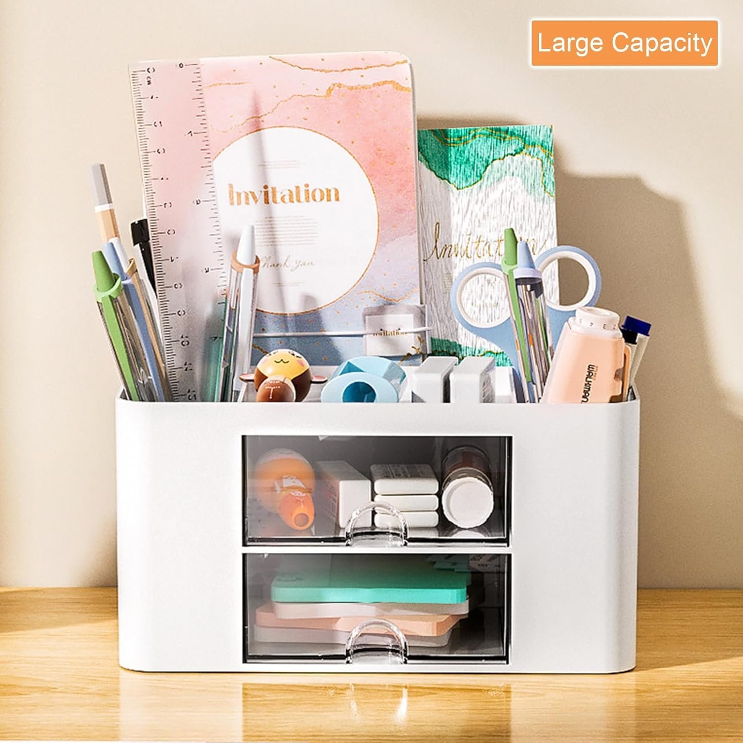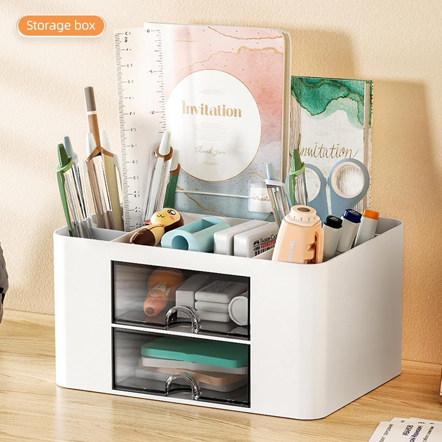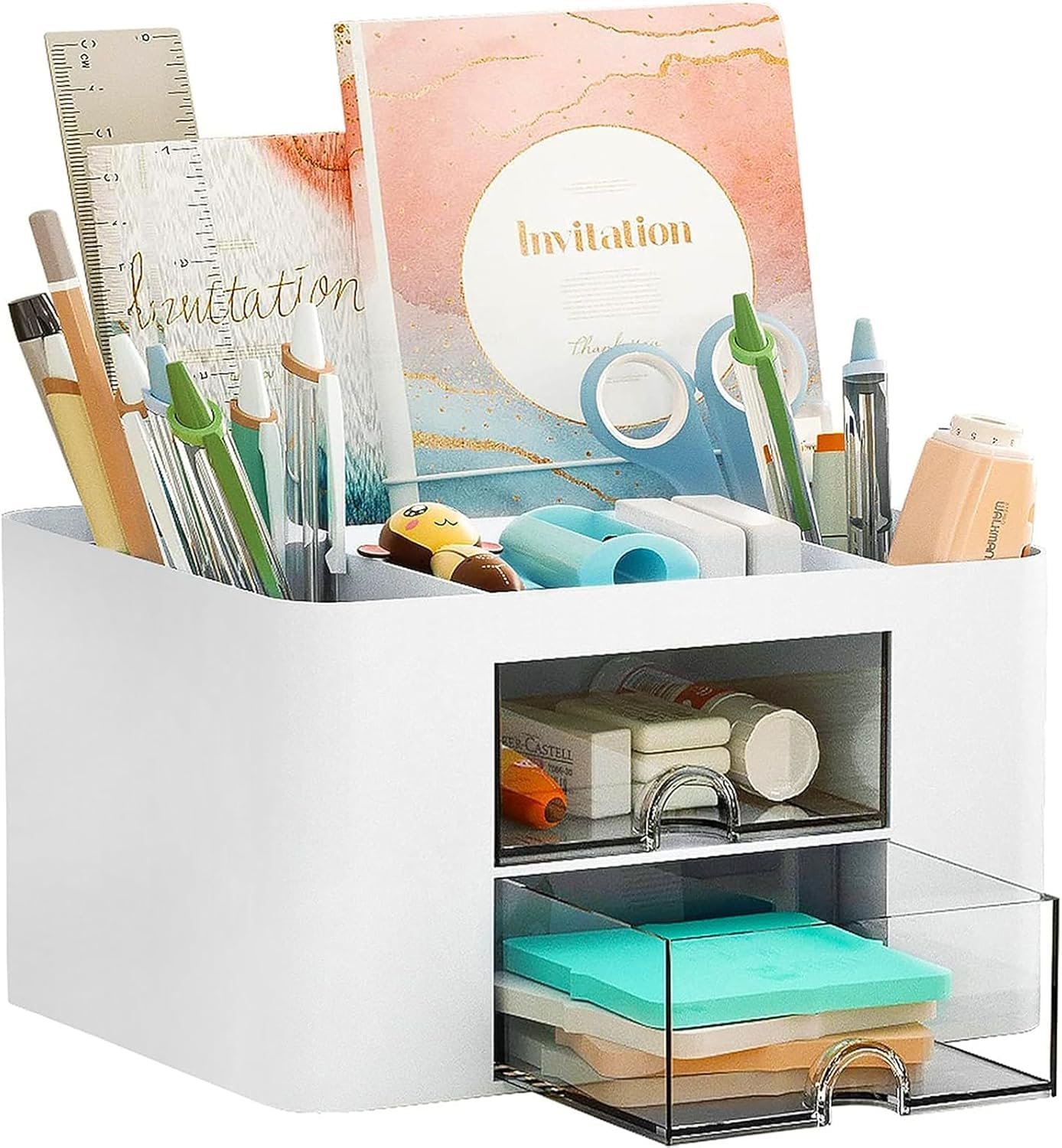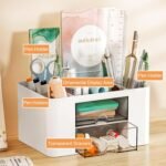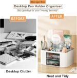 Zeinwap ABS Multi-Functional Desk Organiser With 5 Compartments & 2 Drawer Desktop Office Supplies Stationery Storage Box Cosmetic Organizer For Pens Staplers Clips Sticky Notes – White