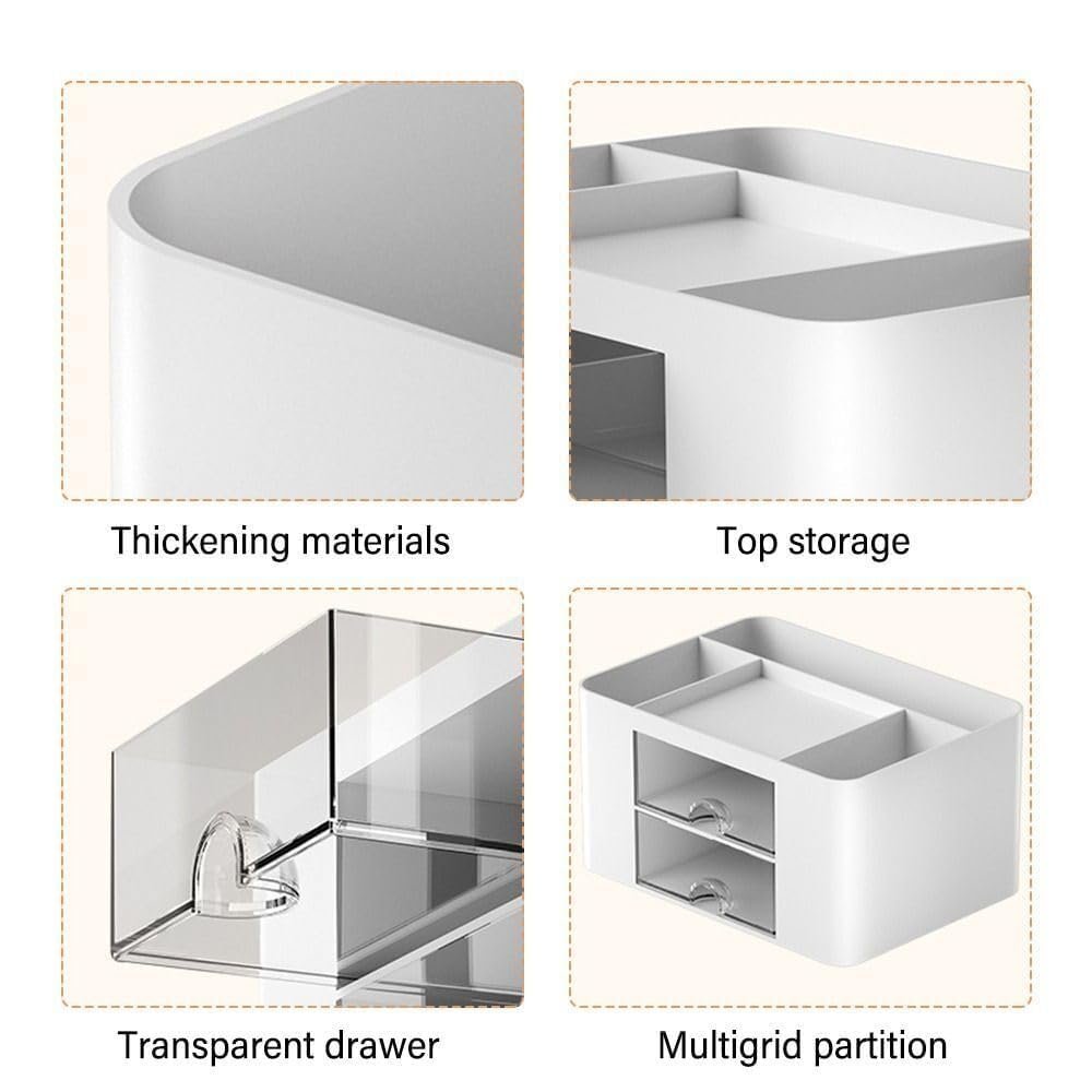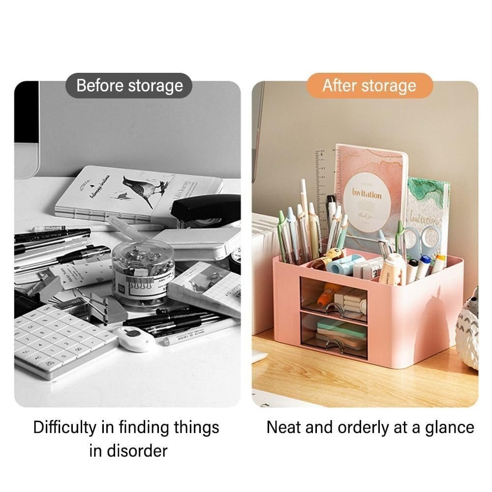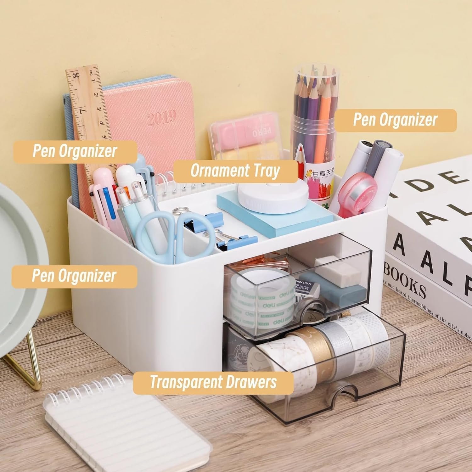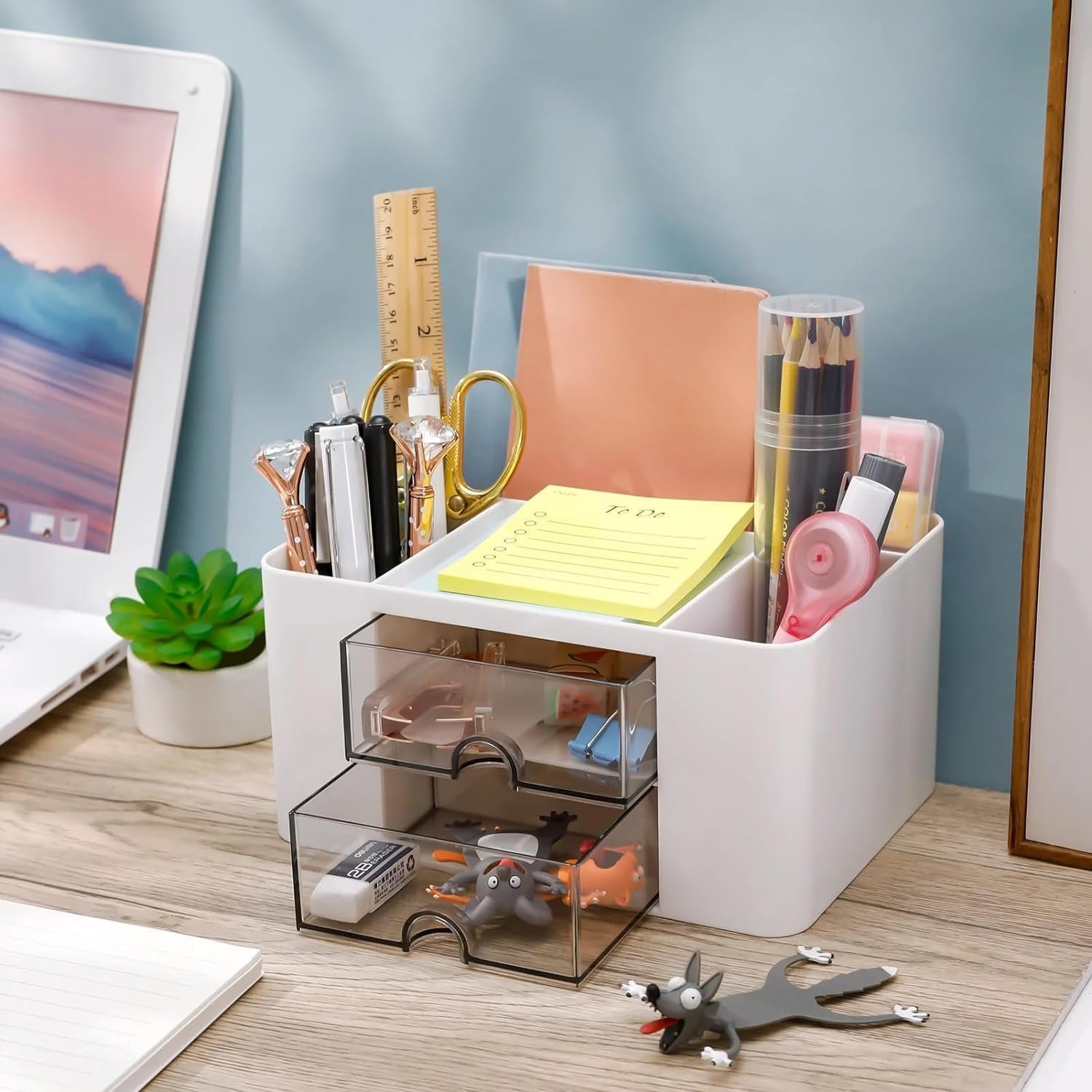 Zollyss Plastic Multi-Functional Desk Organiser With 5 Compartments & 2 Drawer Desktop Office Supplies Stationery Storage Box Cosmetic Organizer For Pens Staplers Clips Sticky Notes (White)